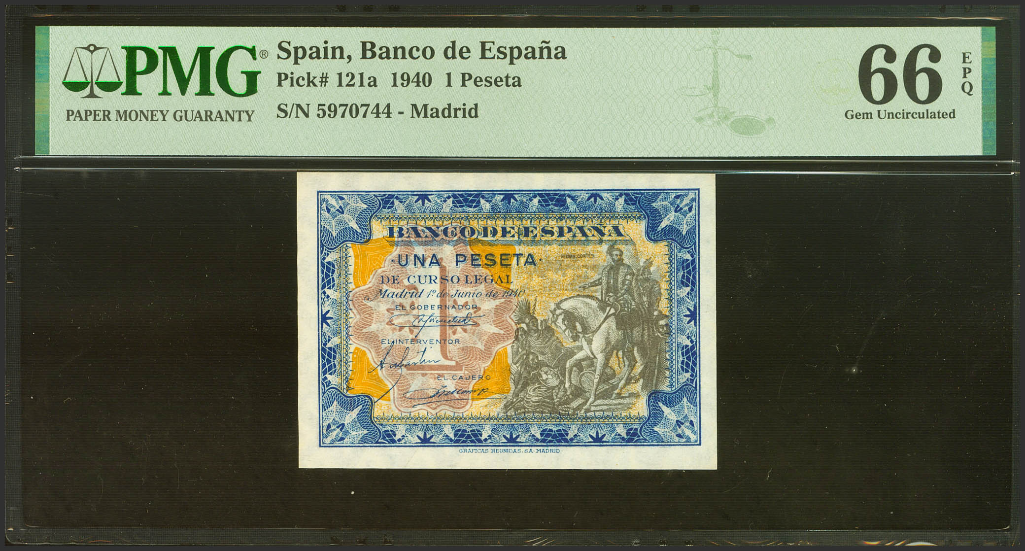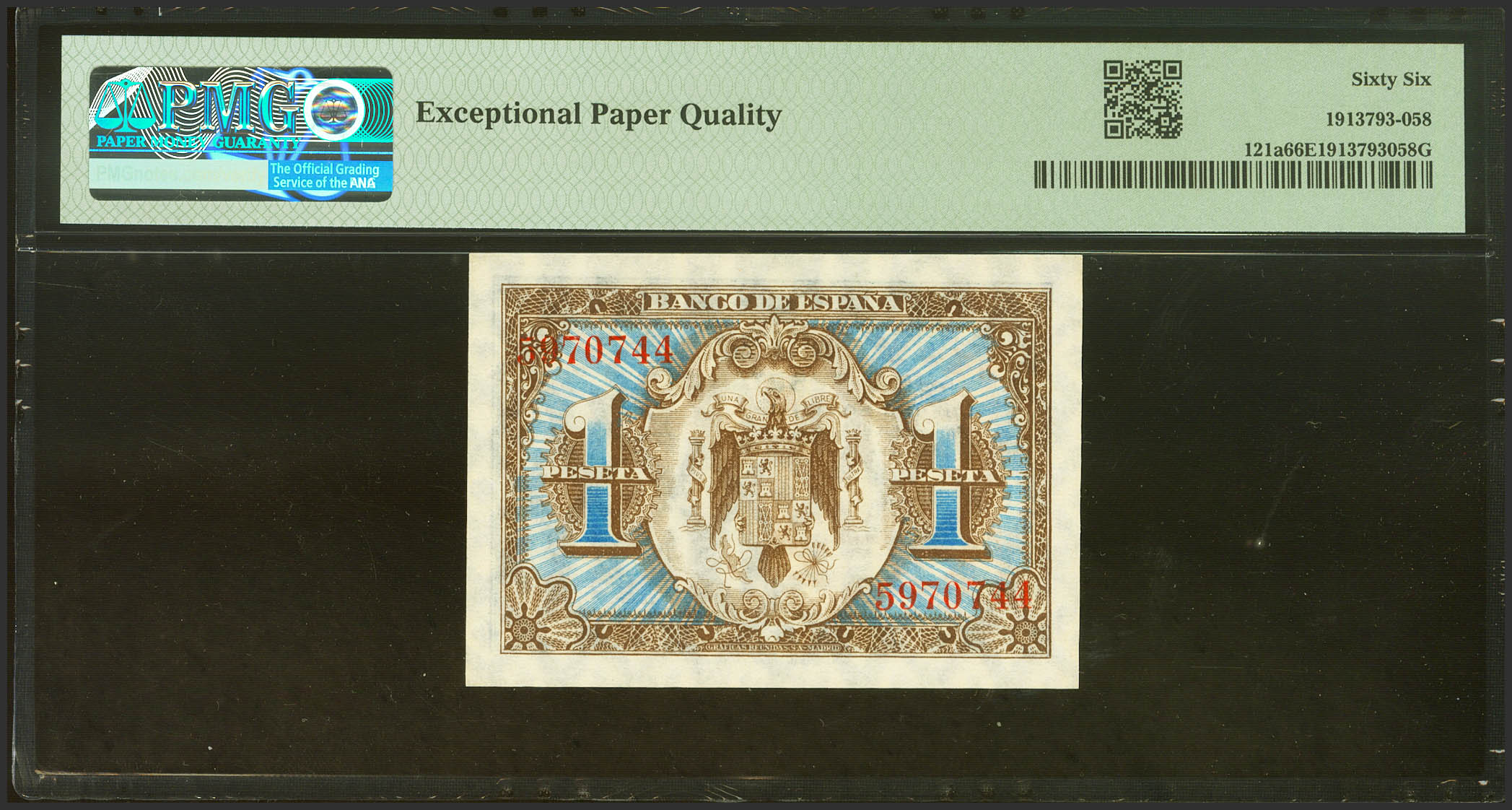 1 Pesetas. 1 de Junio de 1940. Sin serie. (Edifil 2021: 441, Pick: 121a). Raro en esta calidad, apresto original. SC. Encapsulado PMG66EPQ.