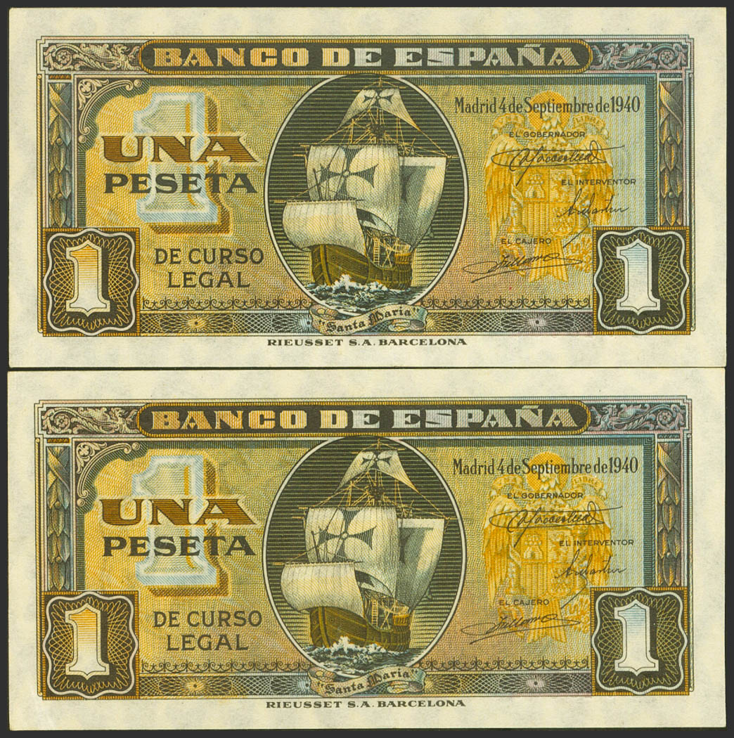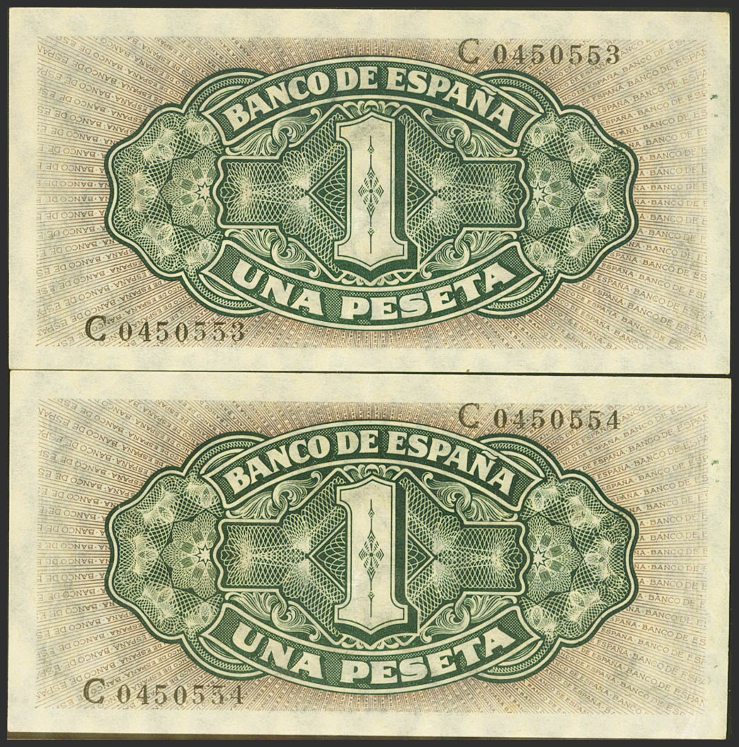 1 Peseta. 4 de Septiembre de 1940. Pareja correlativa. Serie C. (Edifil 2021: 442a). Apresto original. EBC.