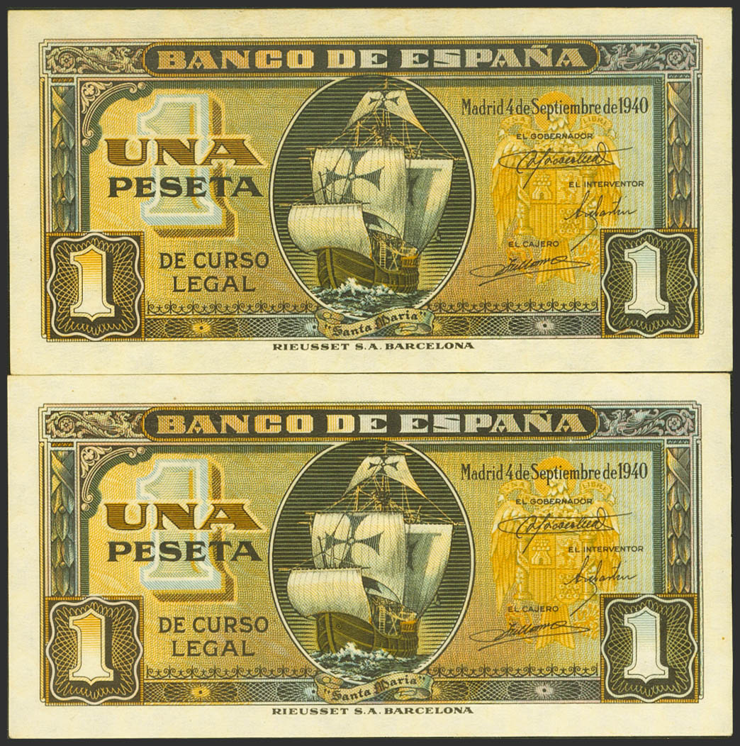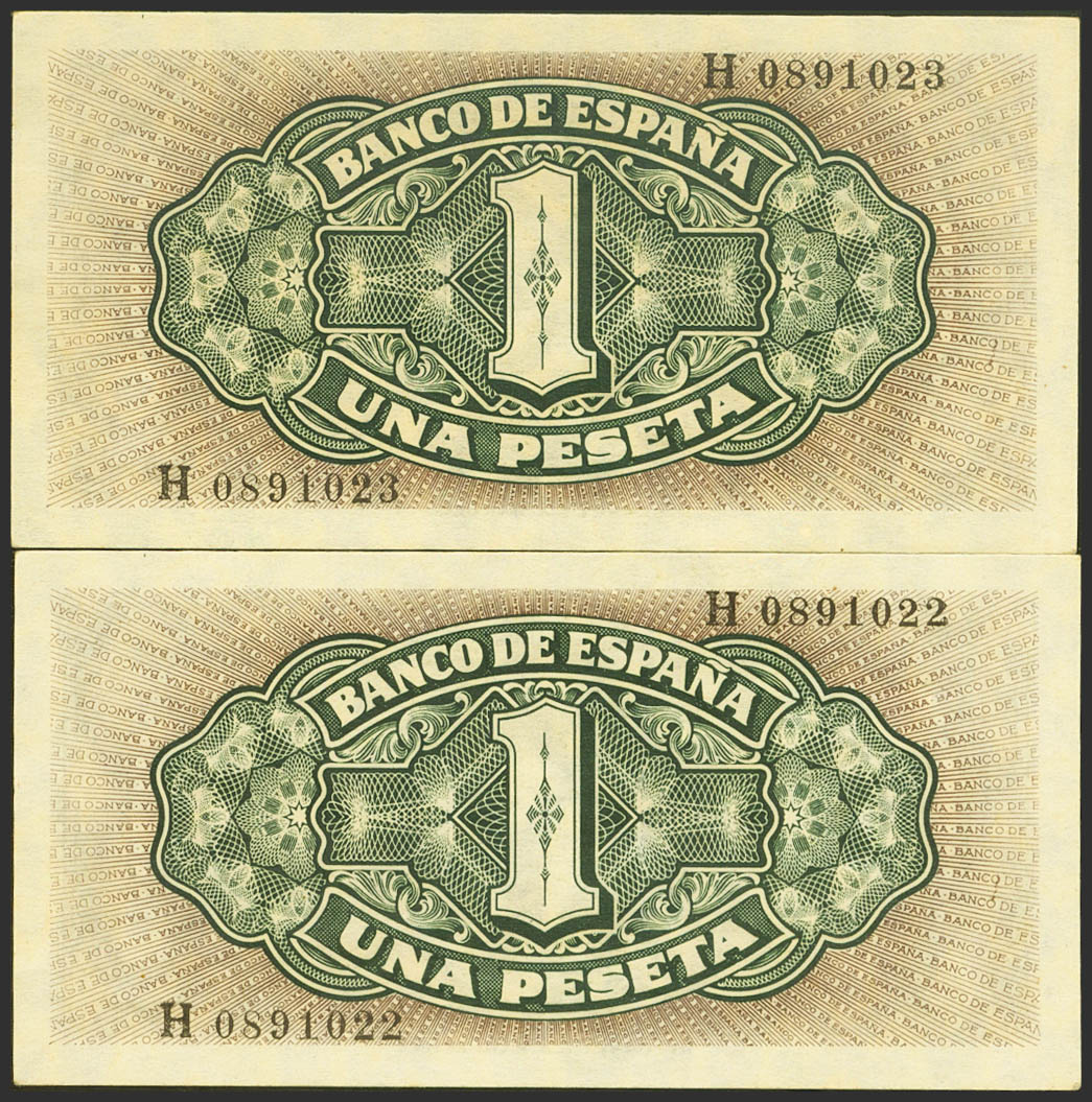 1 Peseta. 4 de Septiembre de 1940. Pareja correlativa. Serie H. (Edifil 2023: 442a). Conserva todo su apresto original. SC.