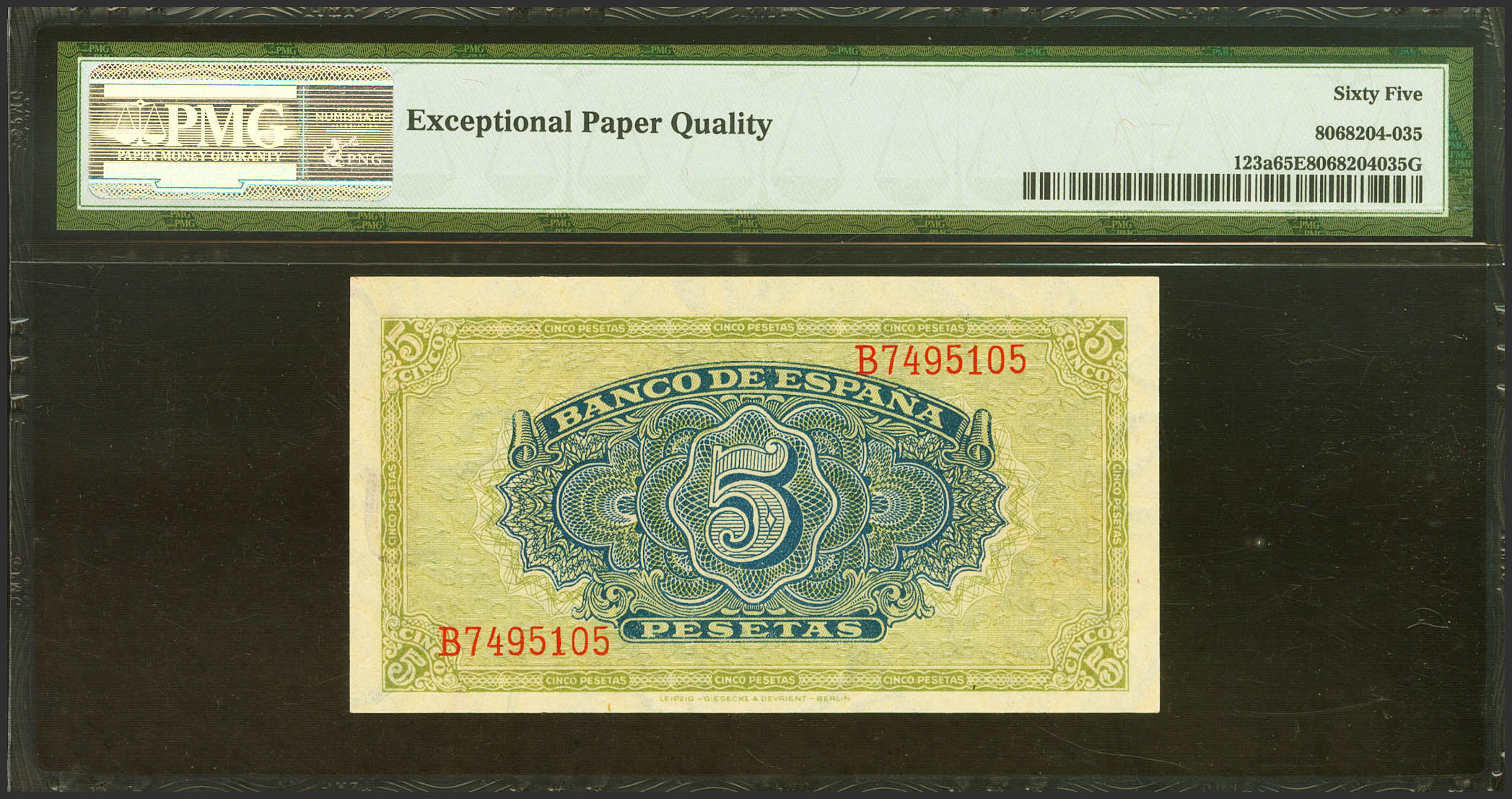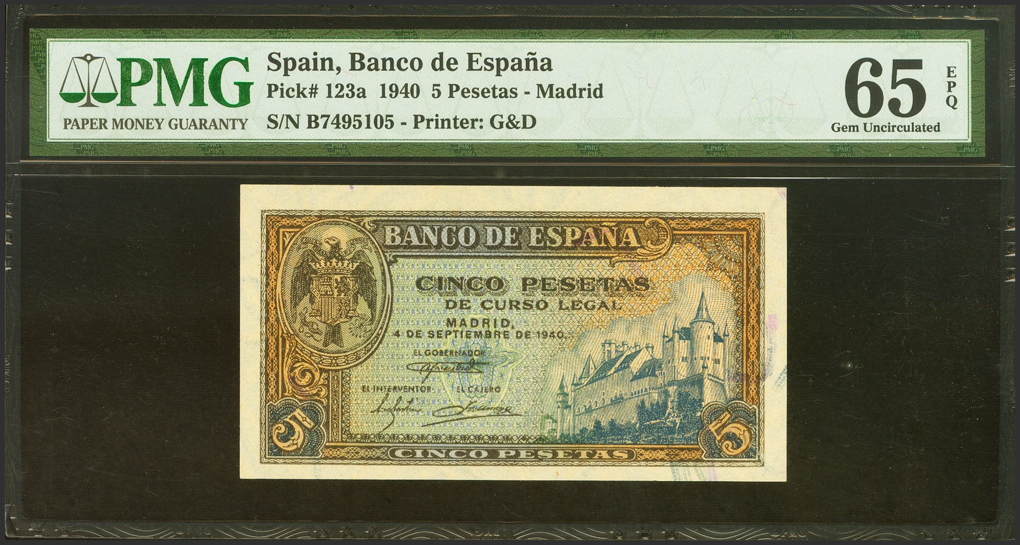 5 Pesetas. 4 de Septiembre de 1940. Serie B. (Edifil 2021: 443a, Pick: 123a). Inusual en esta calidad, apresto original. SC. Encapsulado PMG65EPQ.