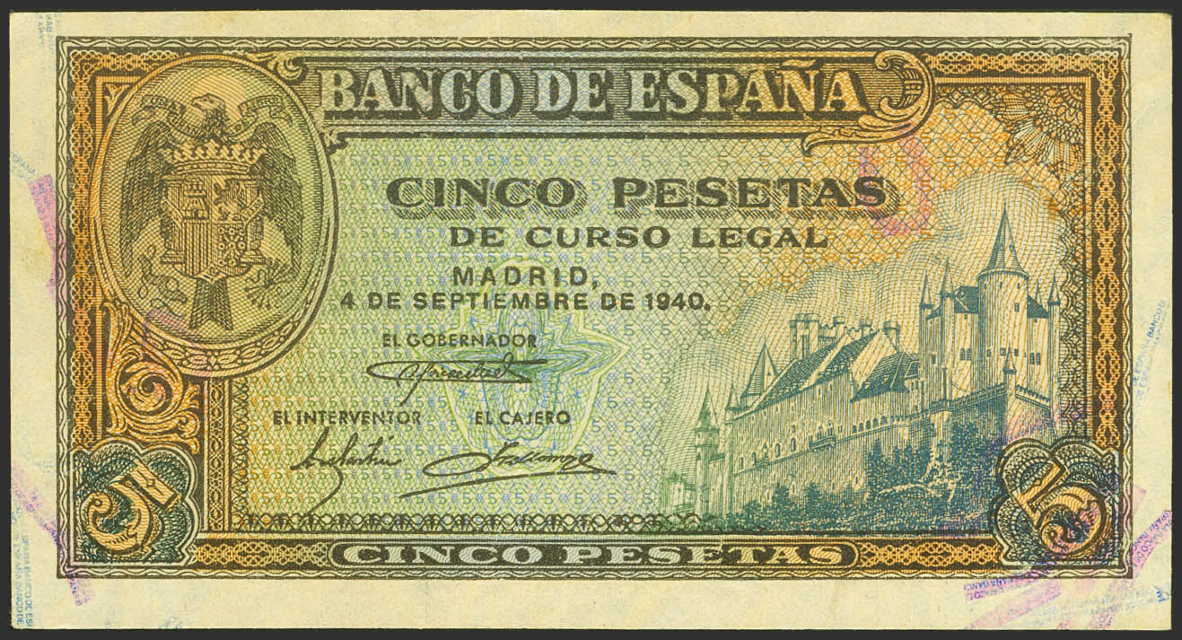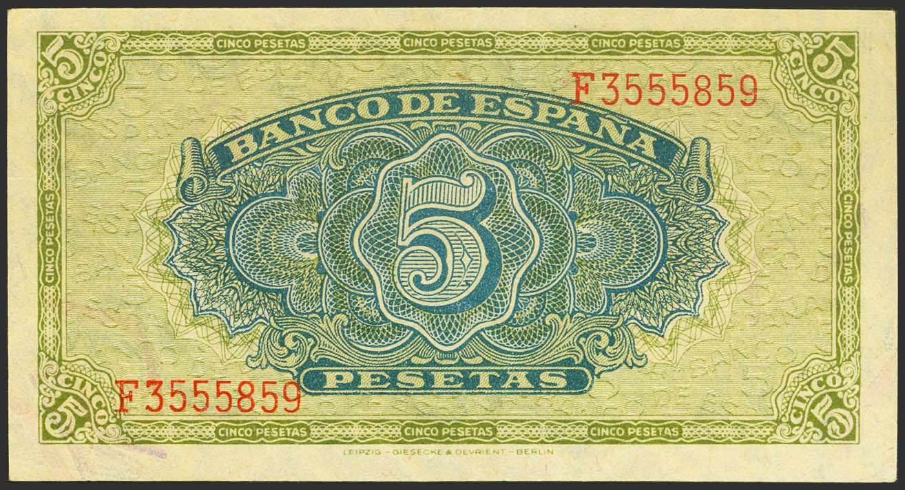 5 Pesetas. 4 de Septiembre de 1940. Serie F. (Edifil 2021: 443a). Conserva parte de su apresto original. EBC+.