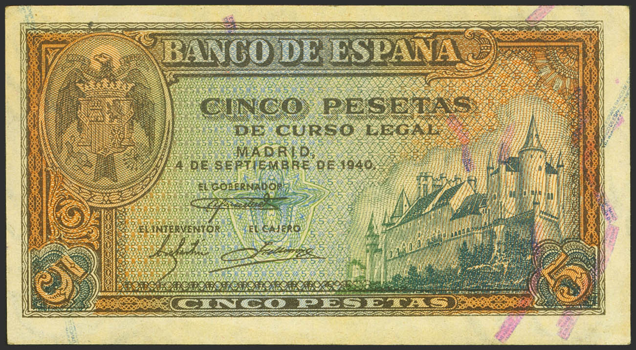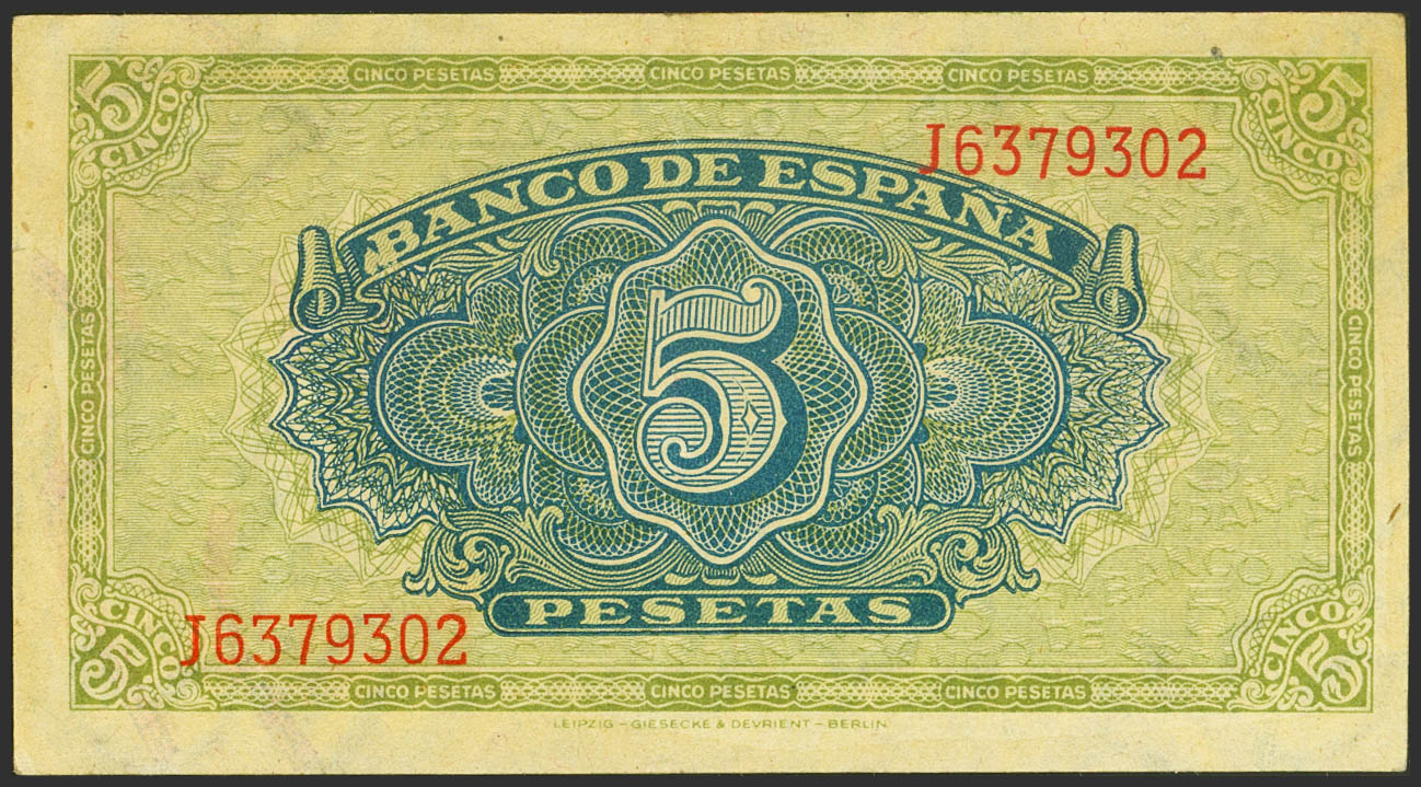 5 Pesetas. 4 de Septiembre de 1940. Serie J. (Edifil 2021: 443a). Conserva gran parte de su apresto original. EBC++.