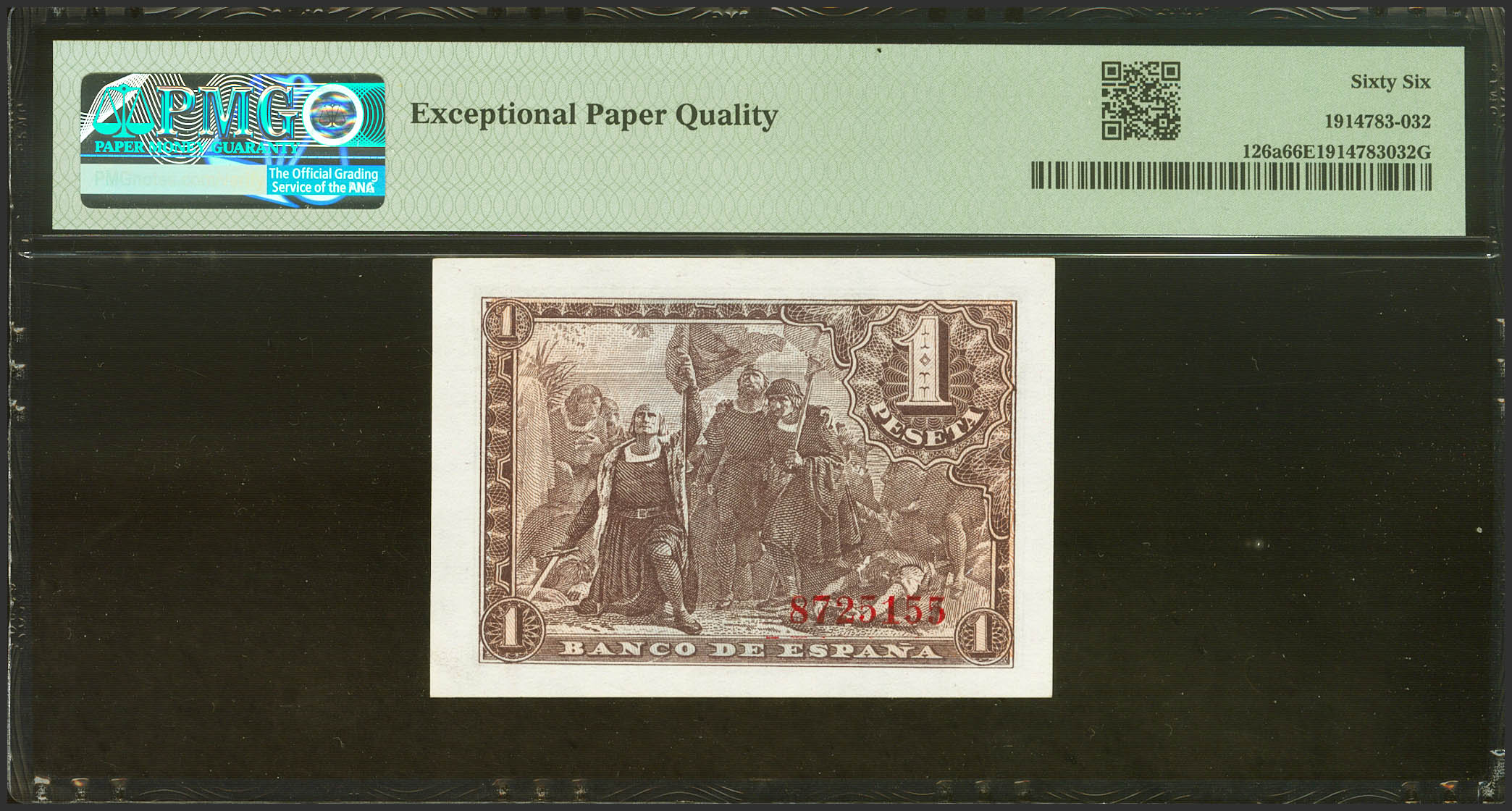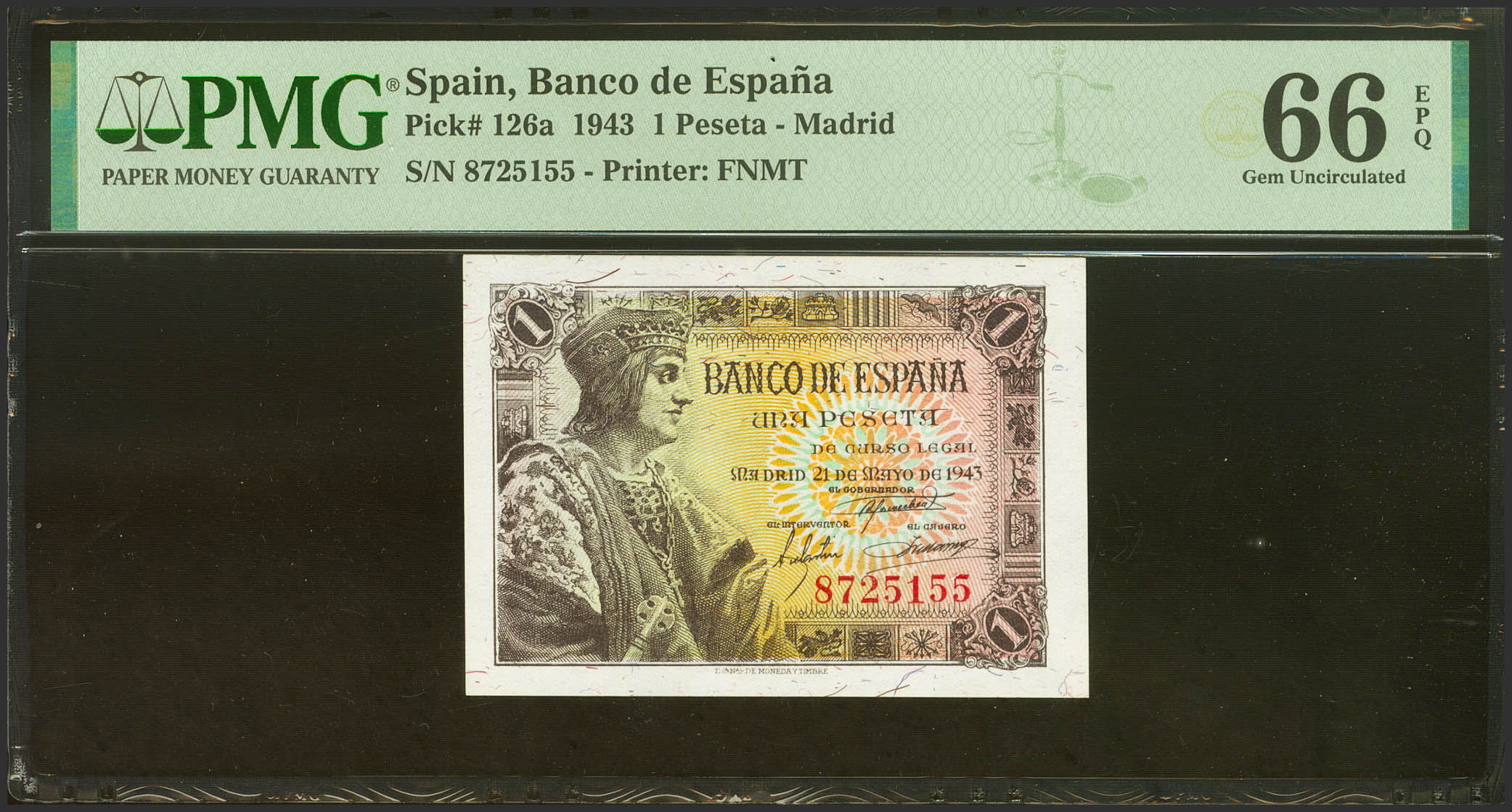 1 Peseta. 21 de Mayo de 1943. Sin serie. (Edifil 2021: 447, Pick: 126a). Inusual en esta calidad, apresto original. SC. Encapsulado PMG66EPQ