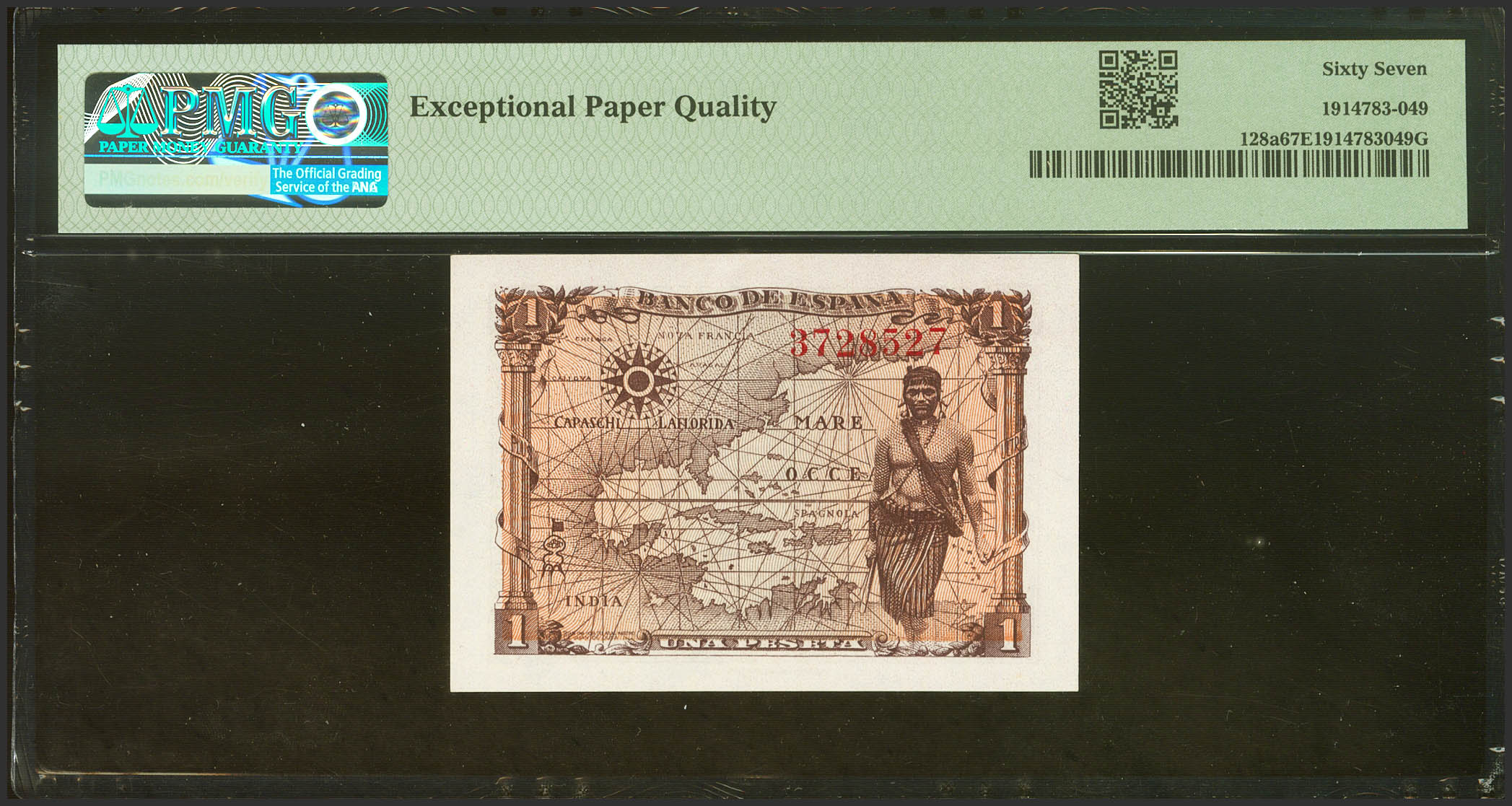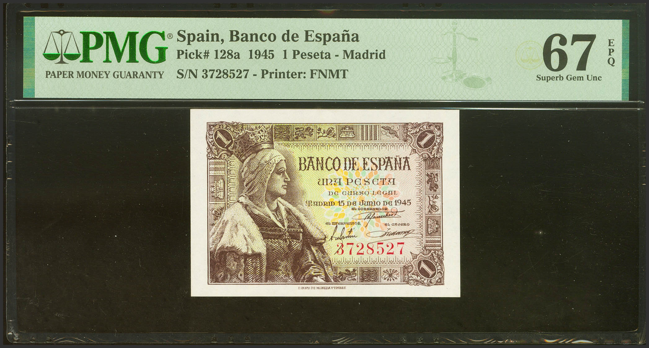 1 Peseta. 15 de Junio de 1945. Sin serie. (Edifil 2021: 448, Pick: 128a). Inusual en esta calidad, apresto original. Encapsulado PMG67EPQ.