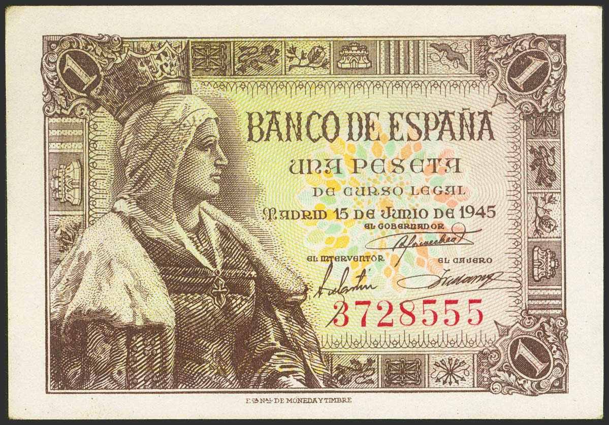 1 Peseta. 15 de Junio de 1945. Sin serie. (Edifil 2021: 448). Apresto original. SC-.