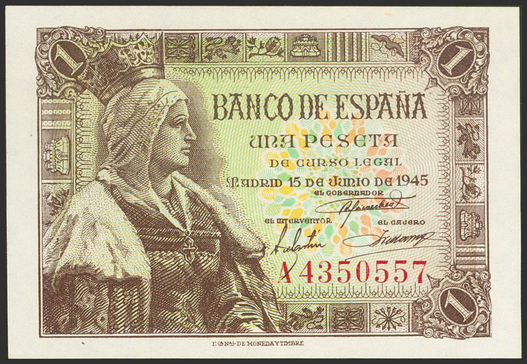 1 Peseta. 15 de Junio de 1945. Serie A. (Edifil 2021: 448a). Apresto original. SC.