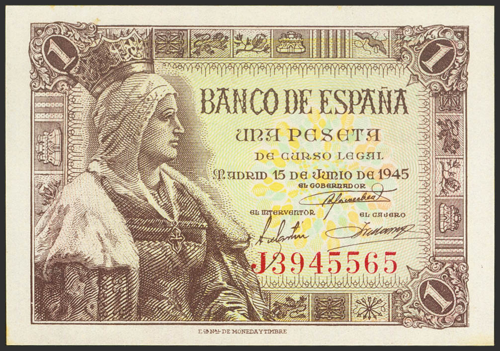 1 Peseta. 15 de Junio de 1945. Serie J. (Edifil 2021: 448a). Apresto original. SC-.