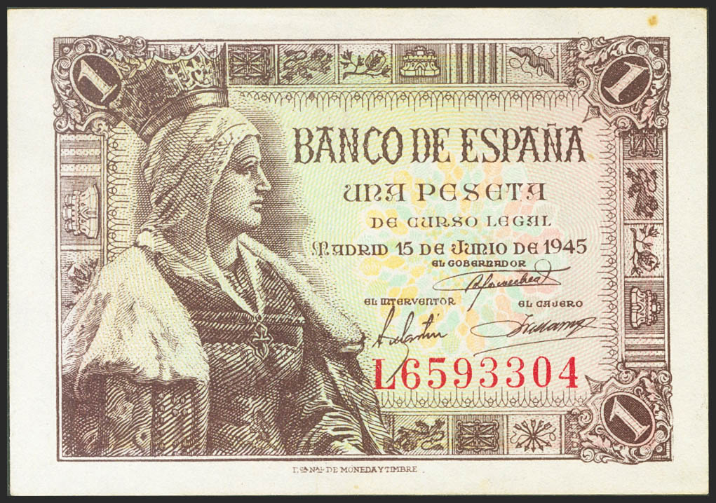 1 Peseta. 15 de Junio de 1945. Serie L. (Edifil 2021: 448a). Apresto original. SC-.