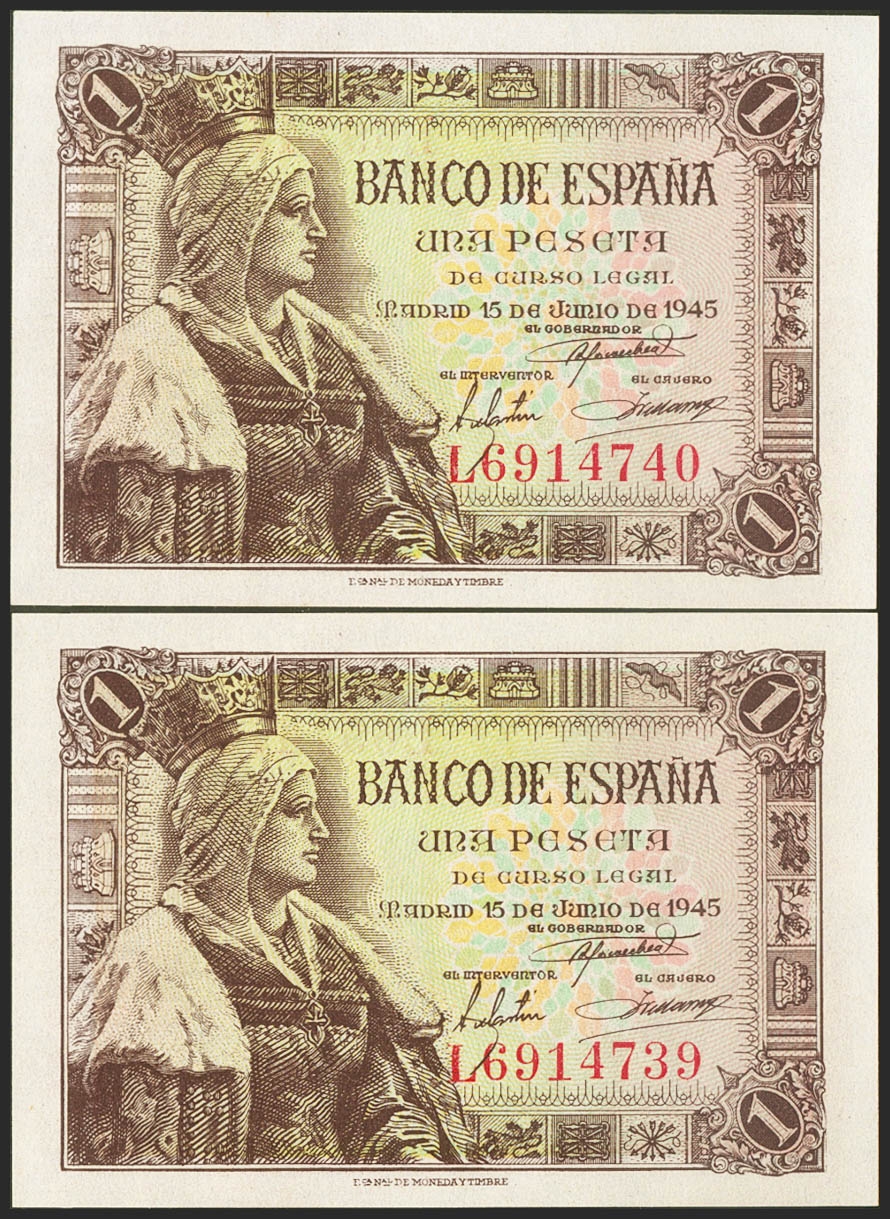 1 Peseta. 15 de Junio de 1945. Pareja correlativa. Serie L. (Edifil 2021: 448a). Apresto original. SC-.
