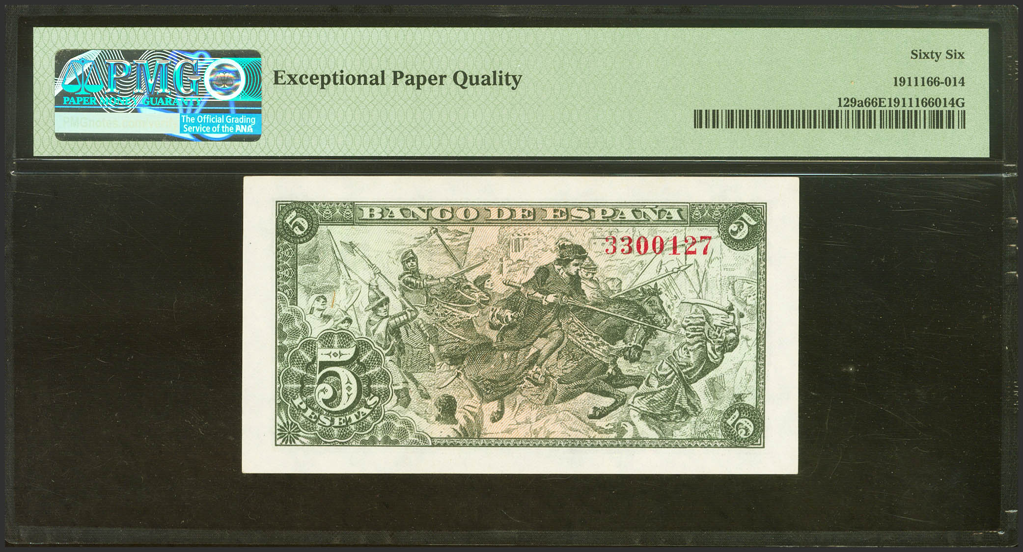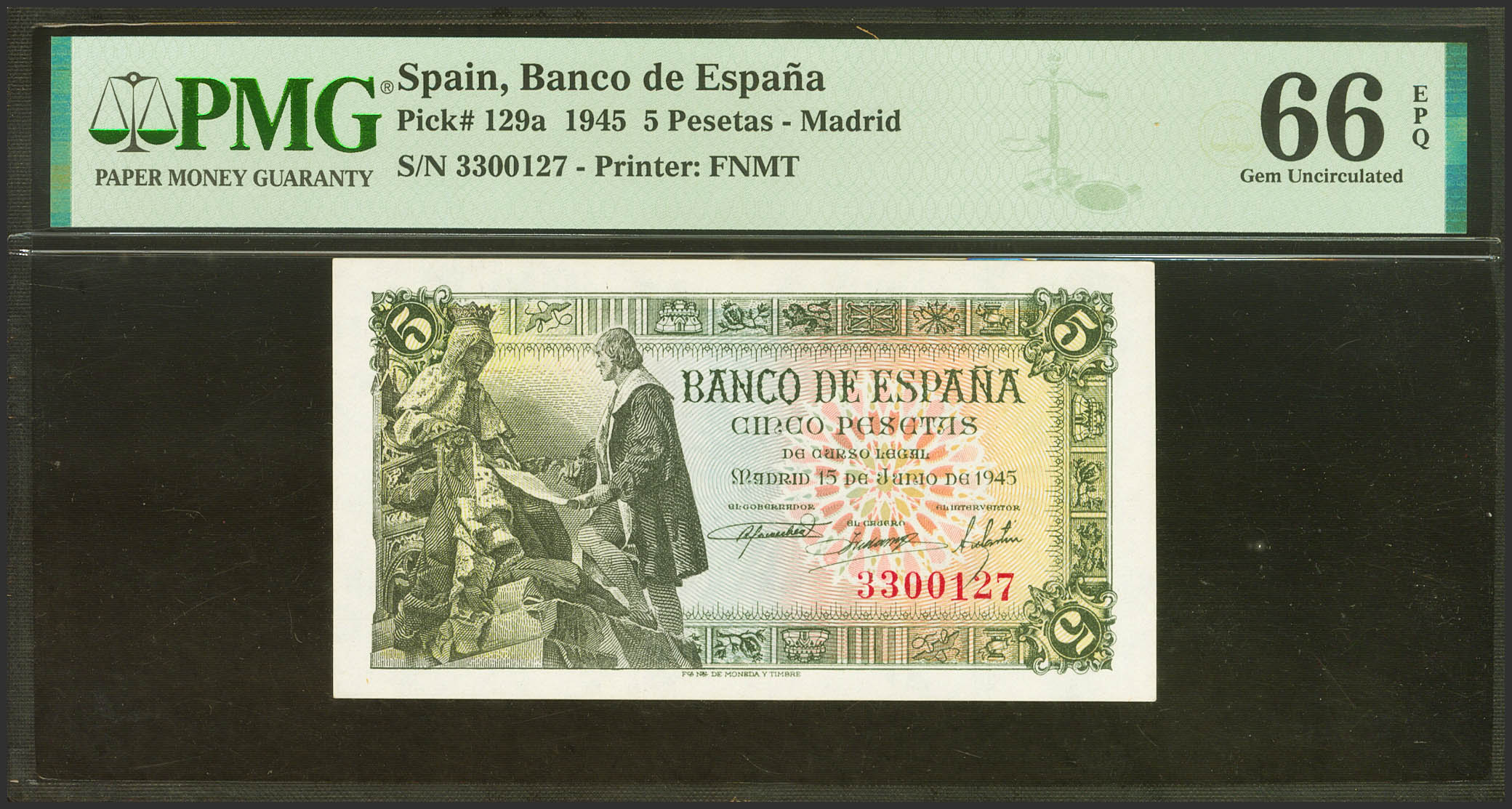 5 Pesetas. 15 de Junio de 1945. Sin serie. (Edifil 2023: 449, Pick: 129a). Raro en esta calidad, apresto original. SC. Encapsulado PMG66EPQ.