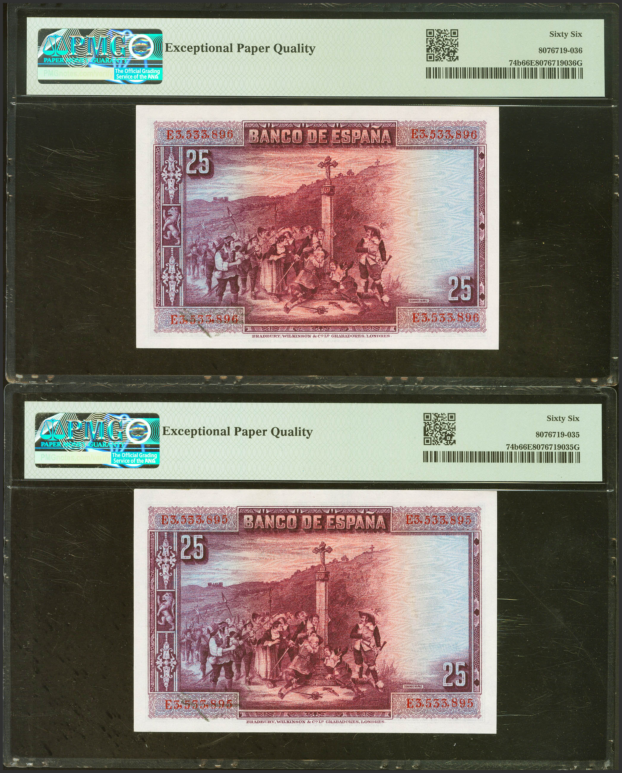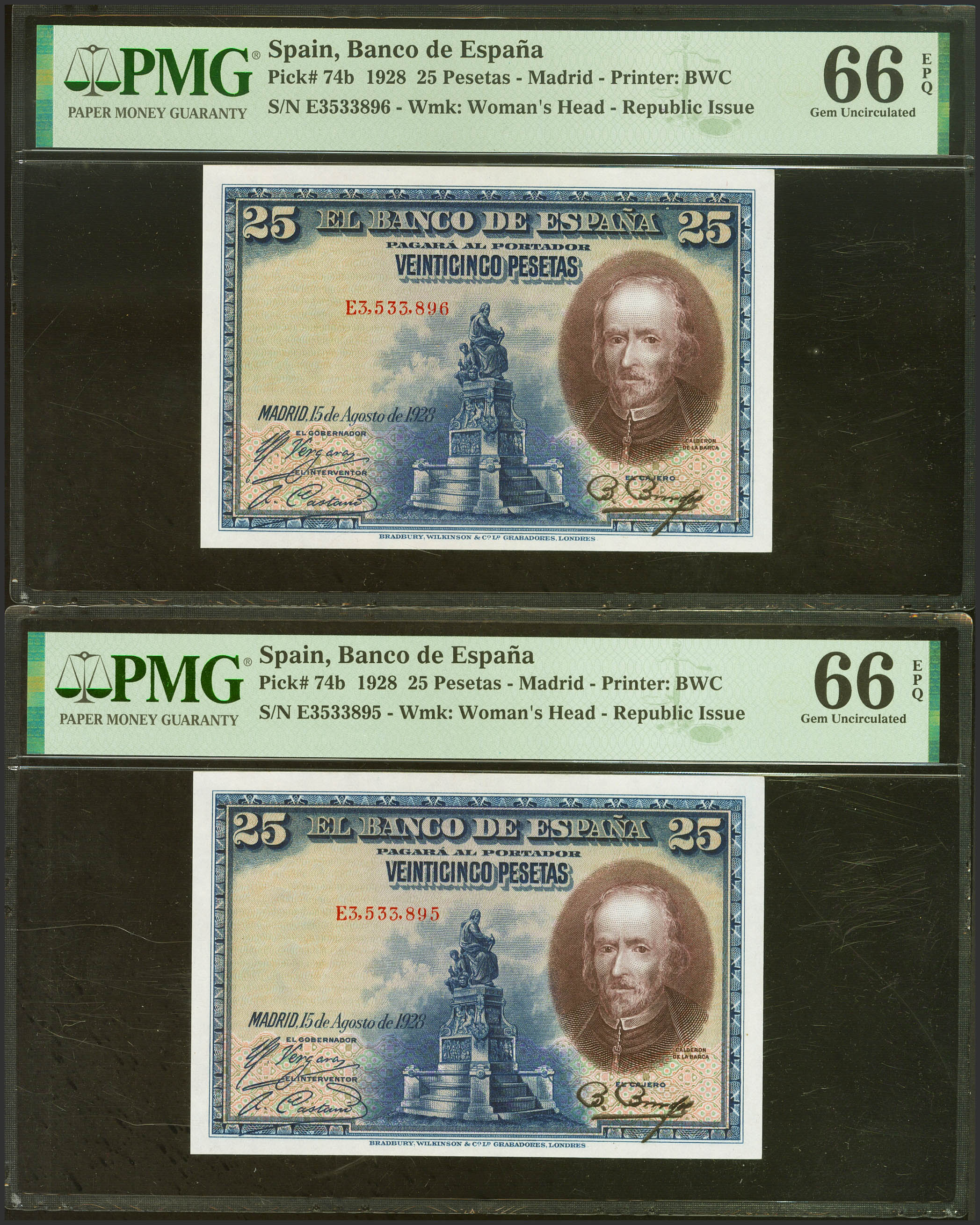 25 Pesetas. 15 de Agosto de 1928. Pareja correlativa. Serie E. (Edifil 2021: 353). Apresto original. SC. Encapsulado PMG66EPQ, ambos.