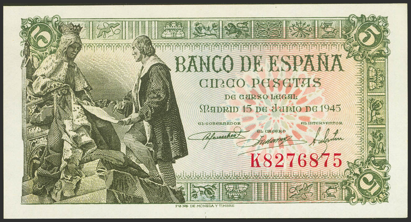 5 Pesetas. 15 de Julio de 1945. Serie K. (Edifil 2021: 449a). Apresto orignal. SC.