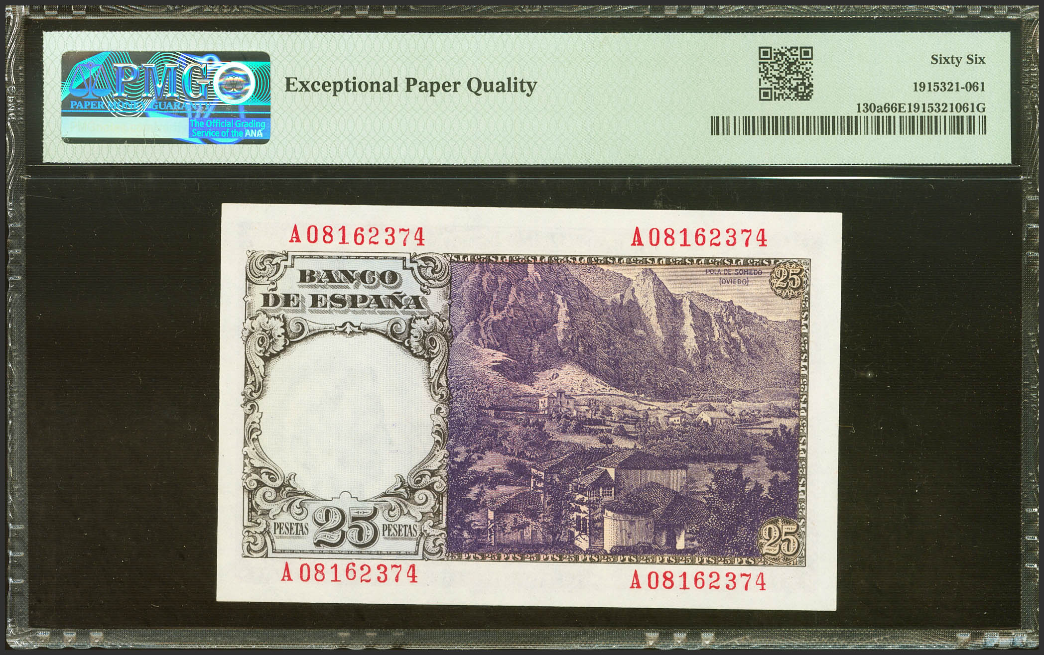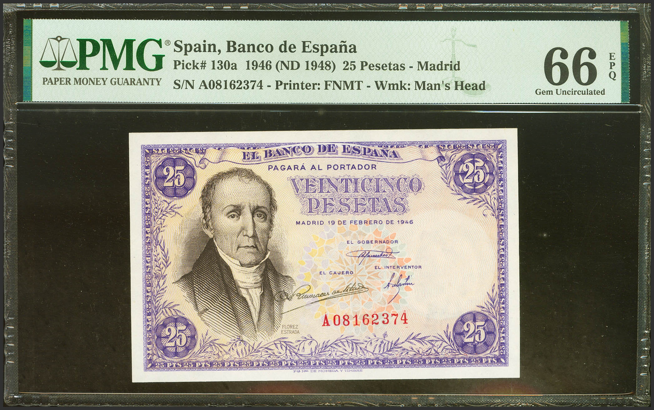 25 Pesetas. 19 de Febrero de 1946. Serie A. (Edifil 2023: 450a, Pick: 130a). Raro en esta excepcional calidad, apresto original. SC. Encapsulado PMG66EPQ.