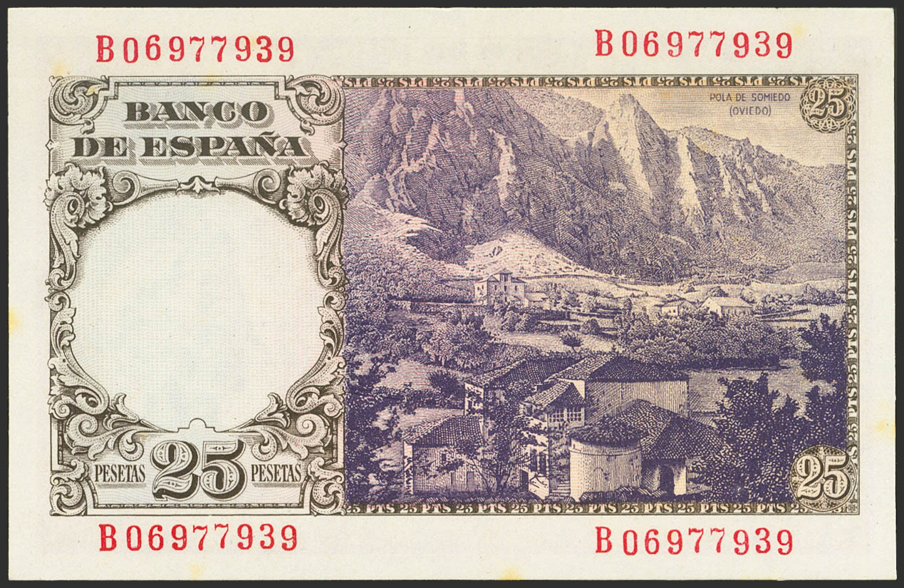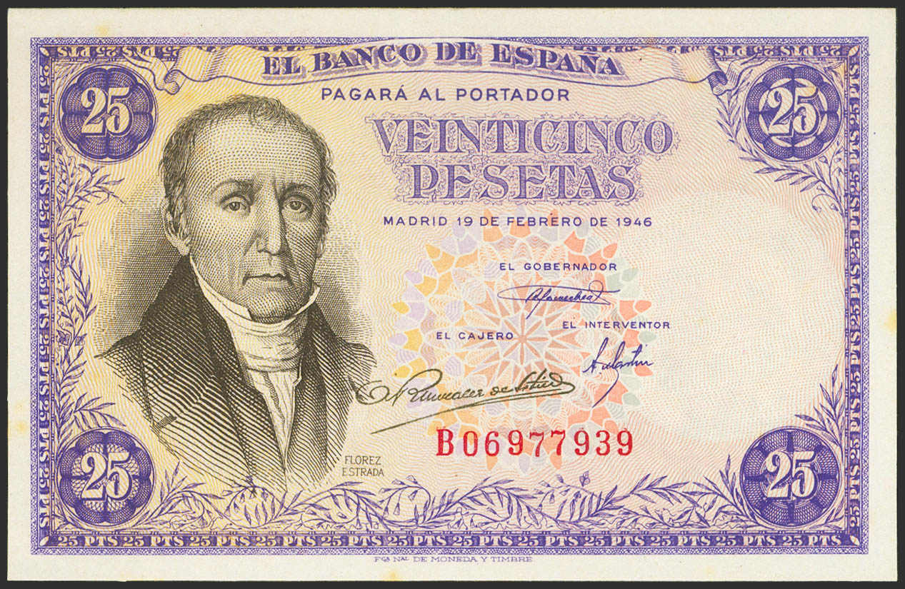 25 Pesetas. 19 de Febrero de 1946. Serie B. (Edifil 2021: 450a). Apresto original y puntitos del tiempo. SC-.