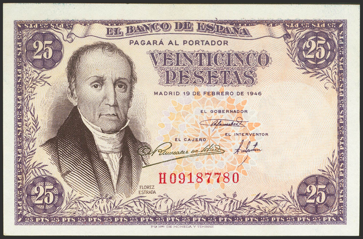 25 Pesetas. 19 de Febrero de 1946. Serie H. (Edifil 2021: 450a). Apresto original. SC.