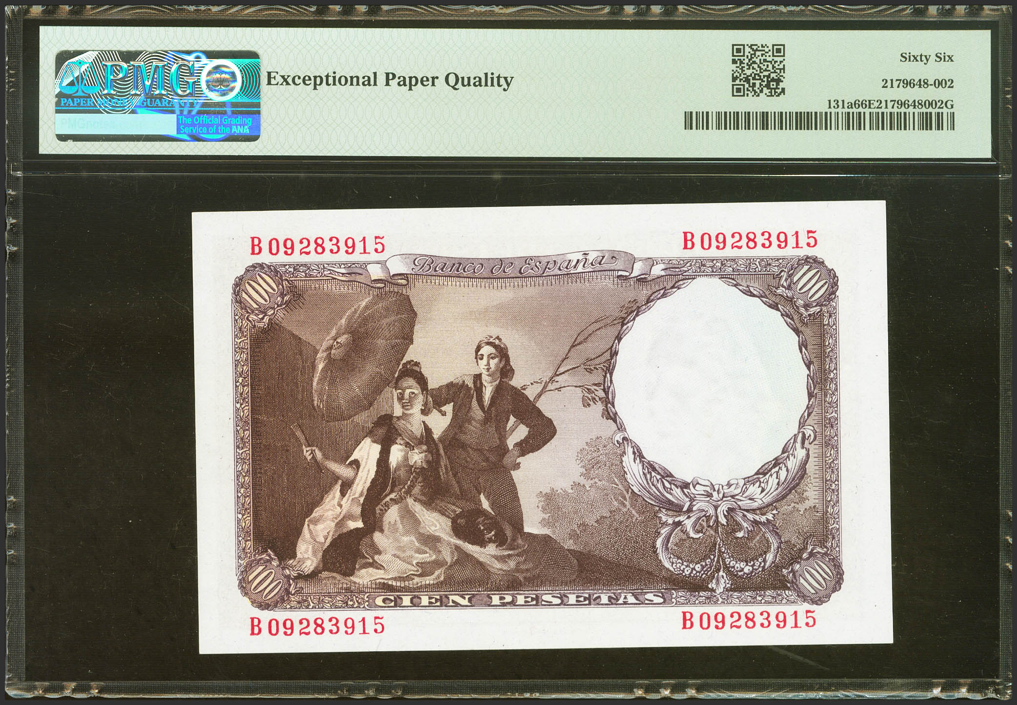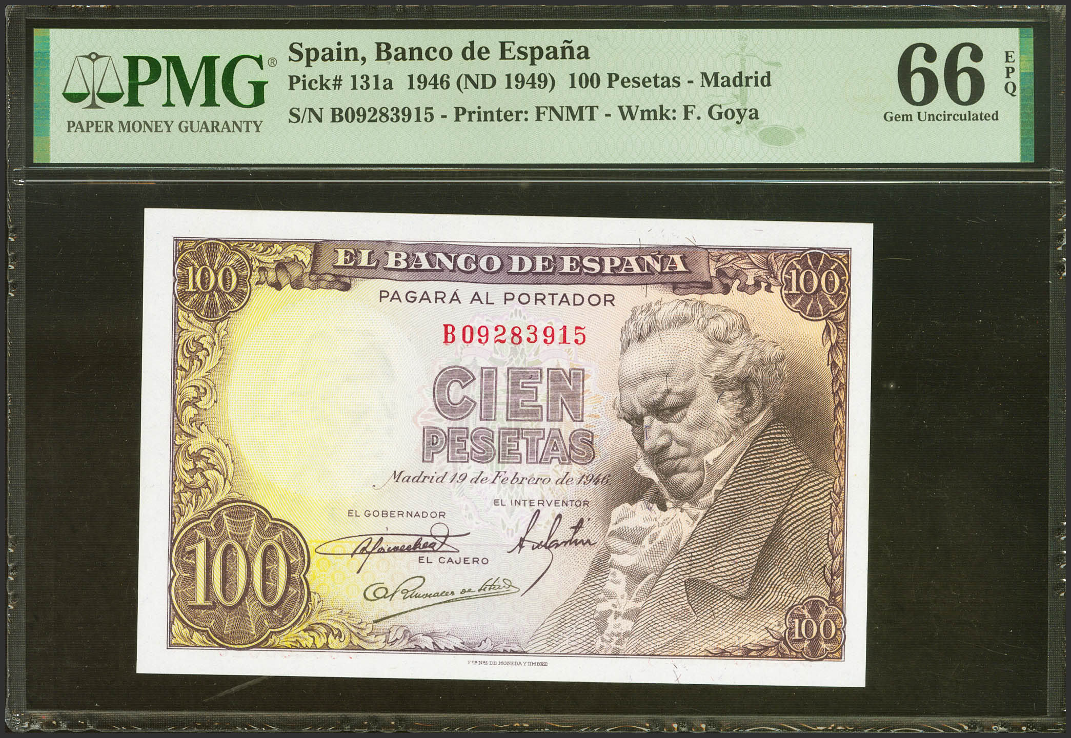 100 Pesetas. 19 de Febrero de 1946. Serie B. (Edifil 2023: 451b, Pick: 131a). Inusual en esta excepcional calidad, apresto original. SC. Encapsulado PMG66EPQ.