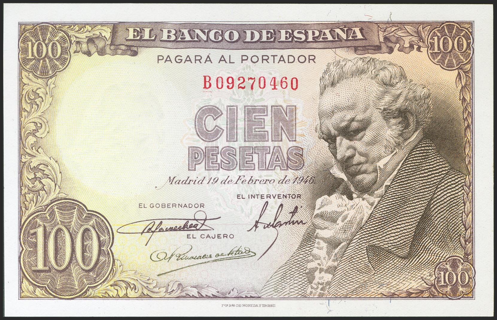 100 Pesetas. 19 de Febrero de 1946. Serie B. (Edifil 2021: 451b, Pick: 131a). Raro en esta superlativa calidad, conserva todo el apresto original. SC.
