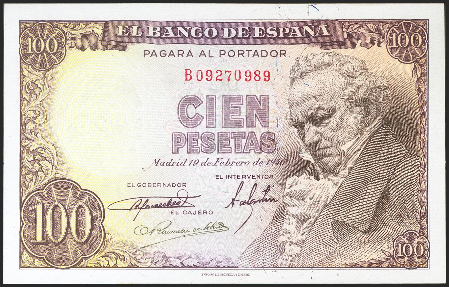 100 Pesetas. 19 de Febrero de 1946. Serie B. (Edifil 2021: 451b). Apresto original. SC-.