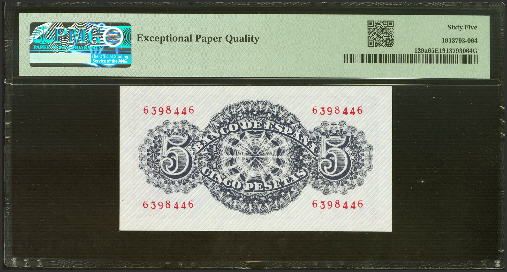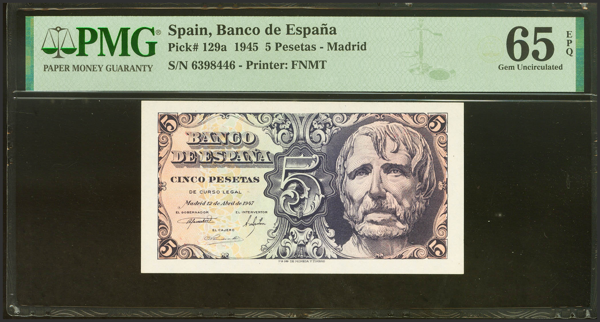5 Pesetas. 12 de Abril de 1947. Sin serie. (Edifil 2021: 454, Pick: 134a). Raro en esta calidad, apresto original. SC. Encapsulado PMG65EPQ.