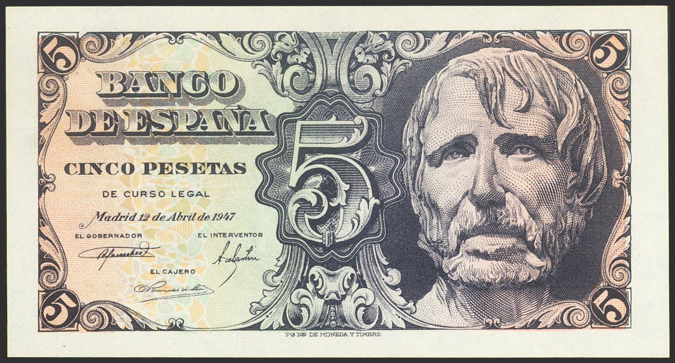5 Pesetas. 12 de Abril de 1947. Sin serie. (Edifil 2023: 454). Apresto original. SC.