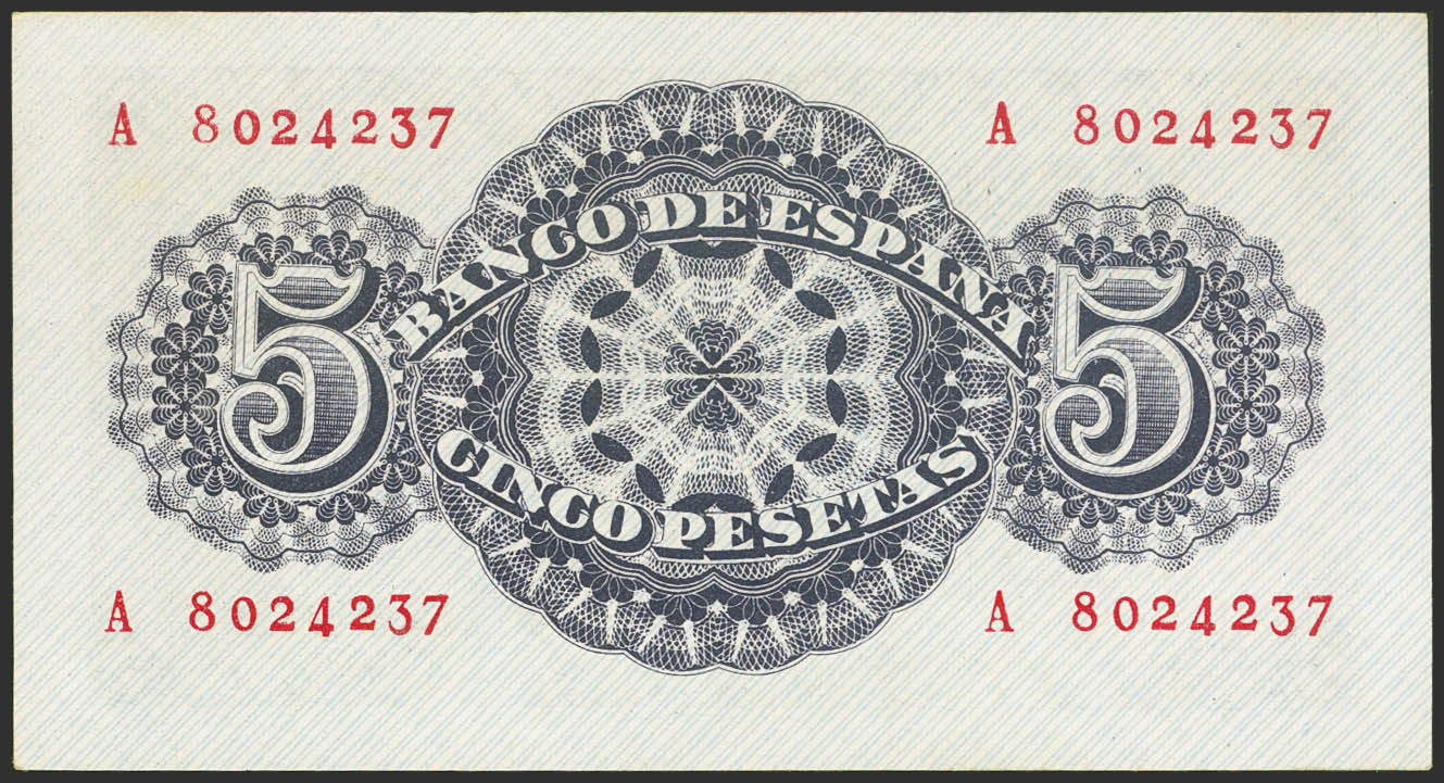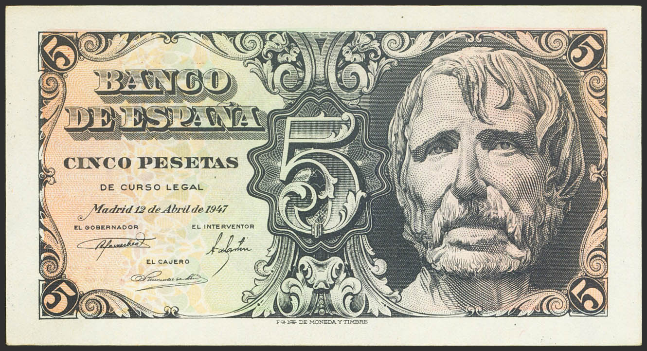 5 Pesetas. 12 de Abril de 1947. Serie A. (Edifil 2021: 454a). Conserva parte del apresto original. SC-.