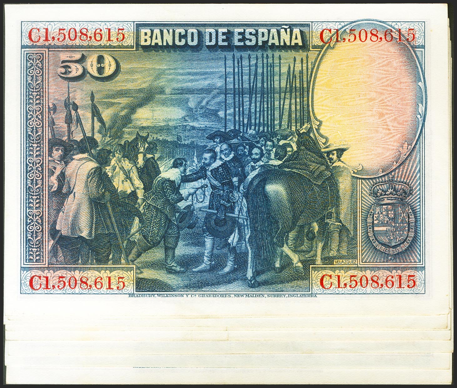 Conjunto de 10 billetes correlativos y en diferentes tramos de 50 Pesetas emitidos el 15 de Agosto de 1928 y con la serie C (Edifil 2021: 354), conservando la mayor parte del apresto original. EBC+.