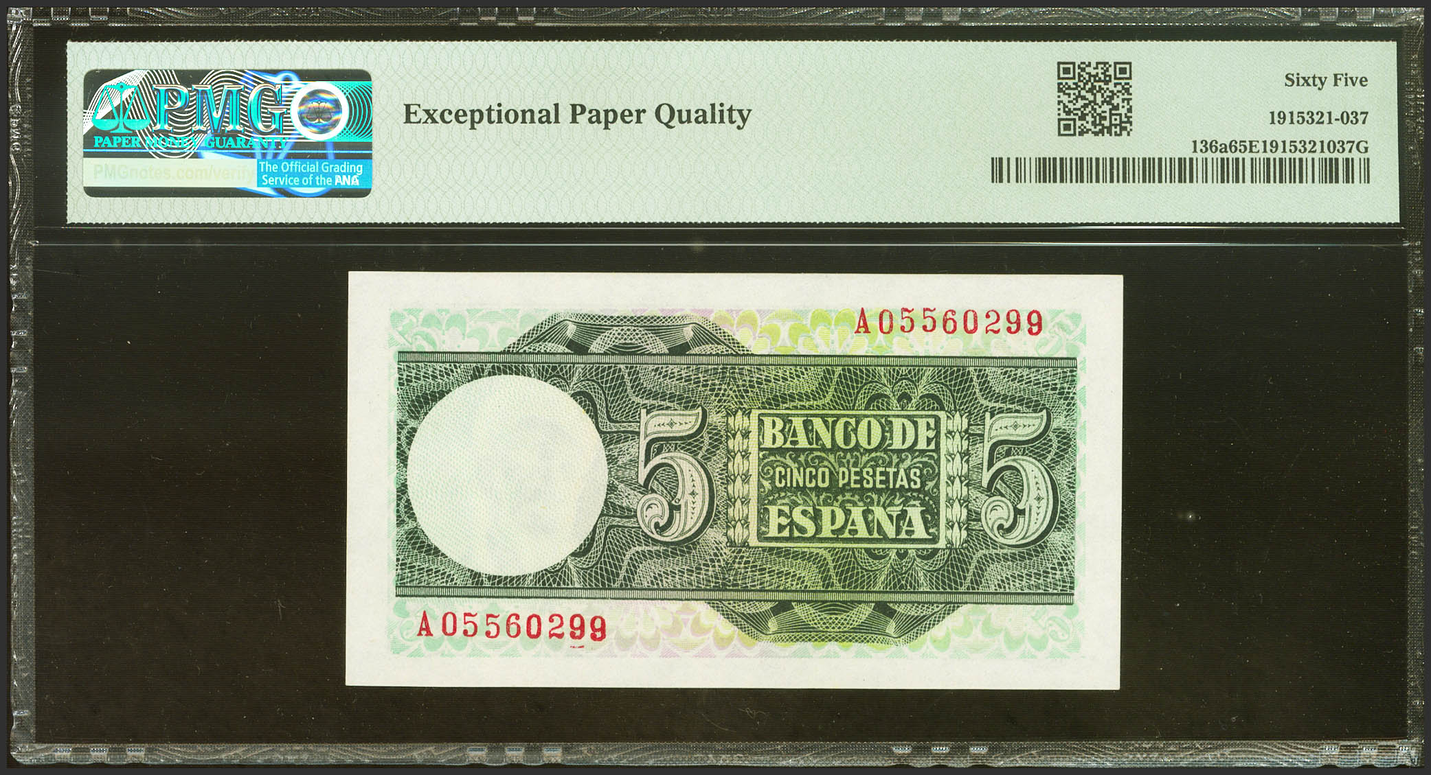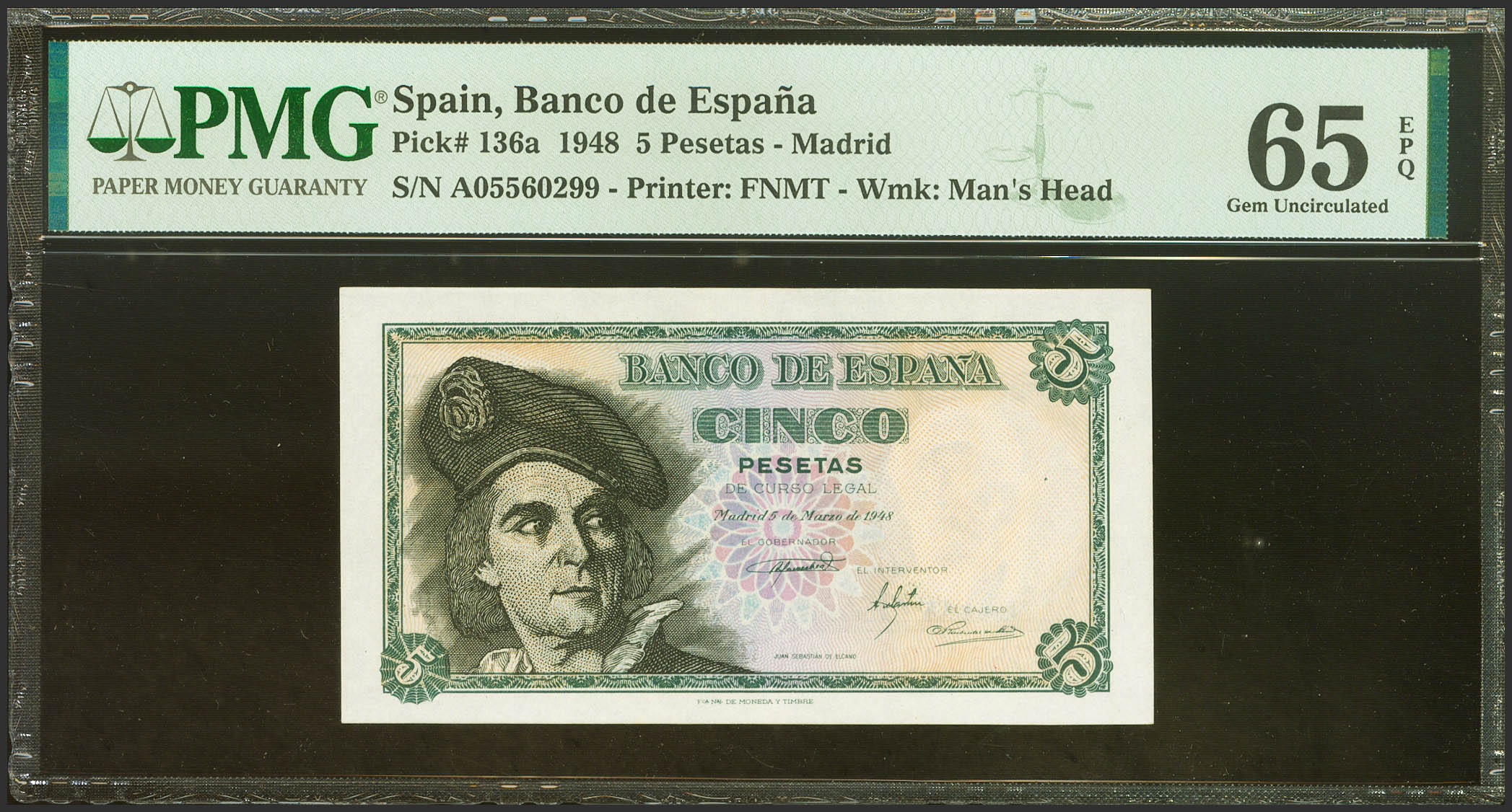 5 Pesetas. 15 de Marzo de 1948. Serie A. (Edifil 2023: 455a, Pick: 136a). Apresto original. SC. Encapsulado PMG65EPQ.