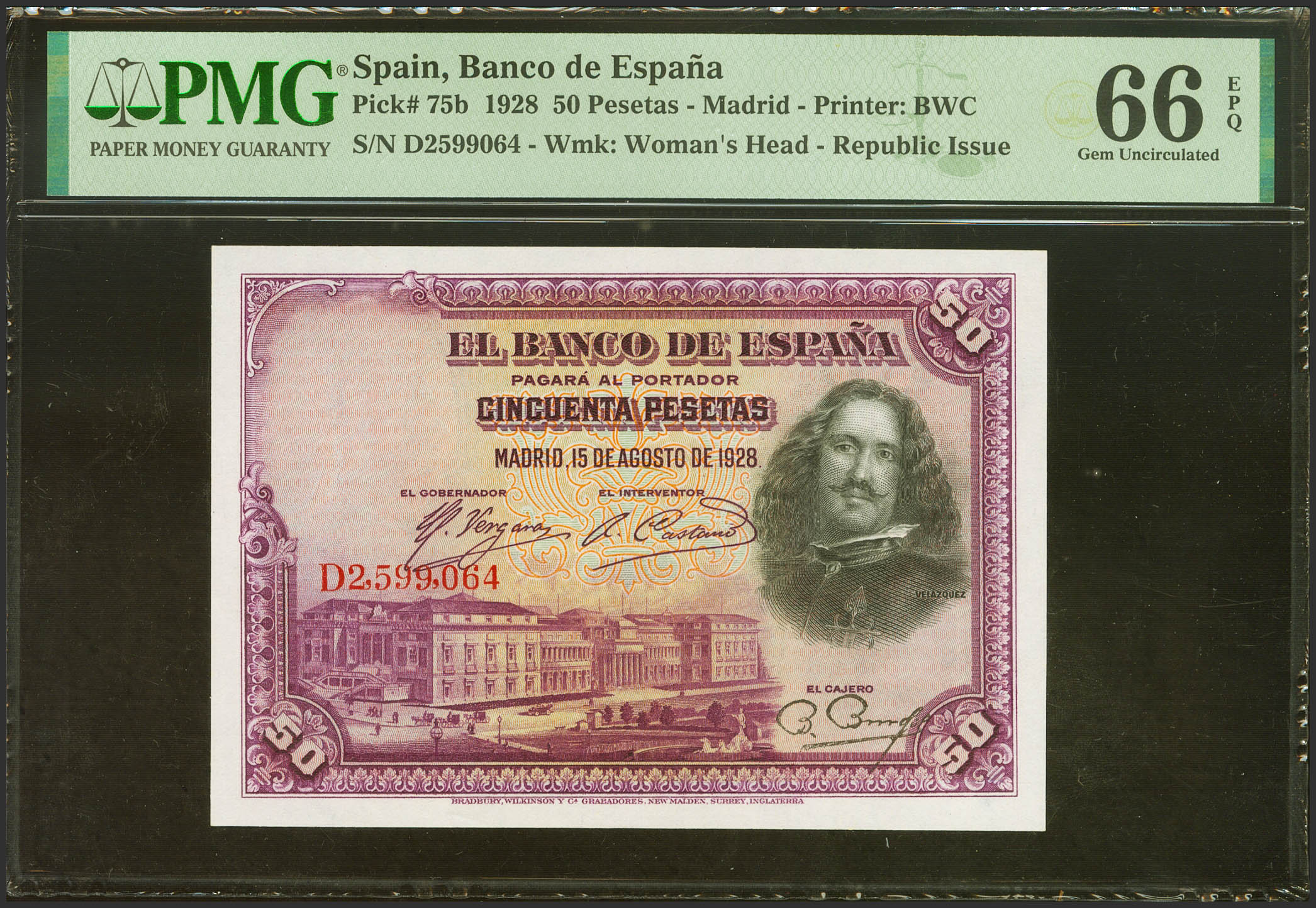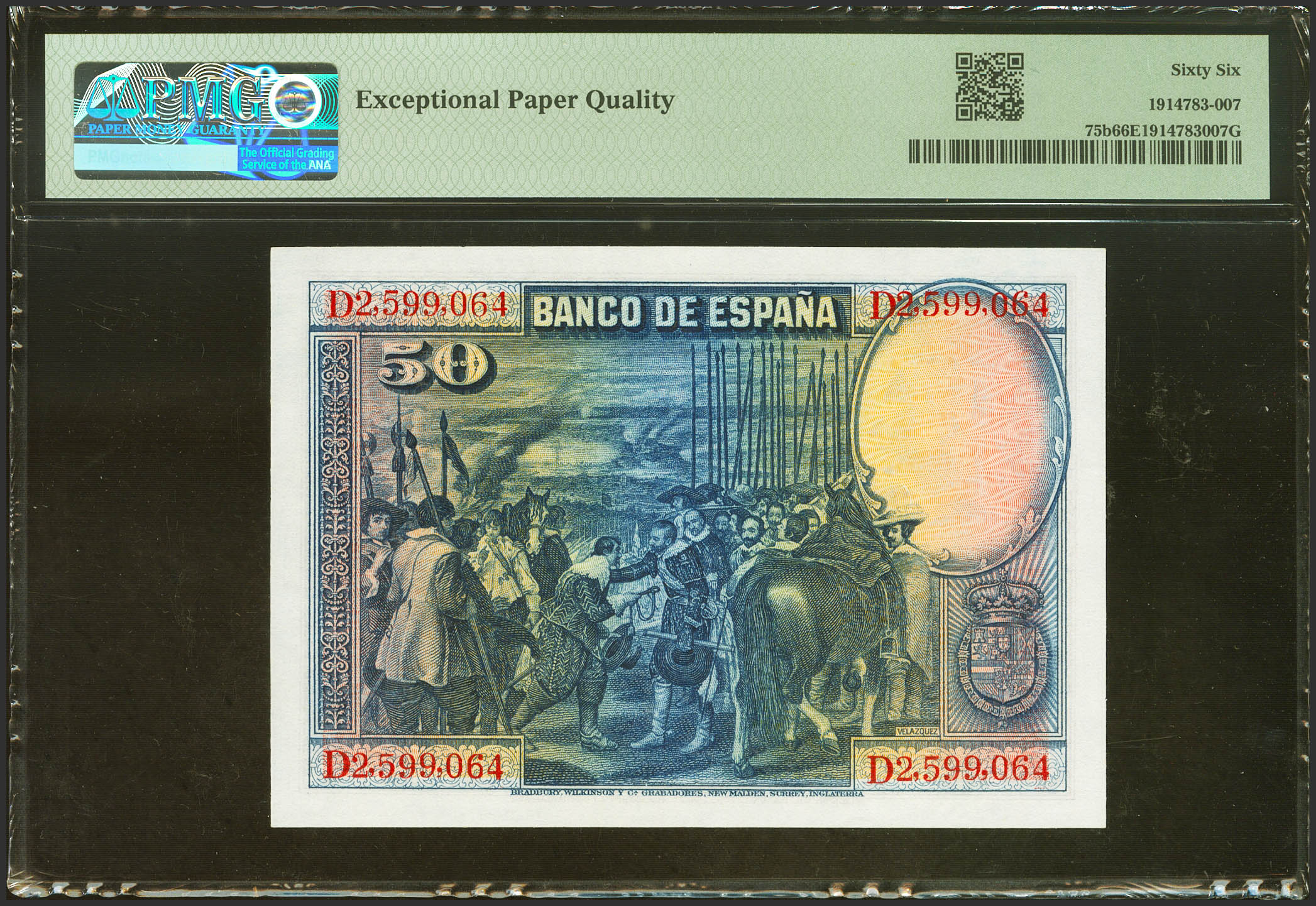 50 Pesetas. 15 de Agosto de 1928. Serie D. (Edifil 2021: 354, Pick: 75b). Apresto original. SC. Encapsulado PMG66EPQ.