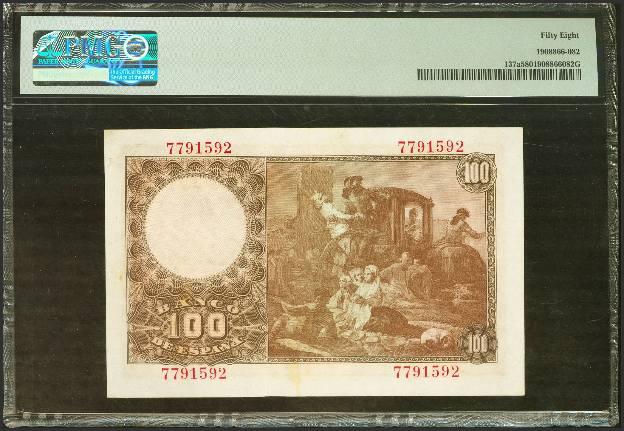 100 Pesetas. 2 de Mayo de 1948. Sin serie. (Edifil 2023: 456, Pick: 137a). Inusual. EBC++. Encapsulado PMG58.