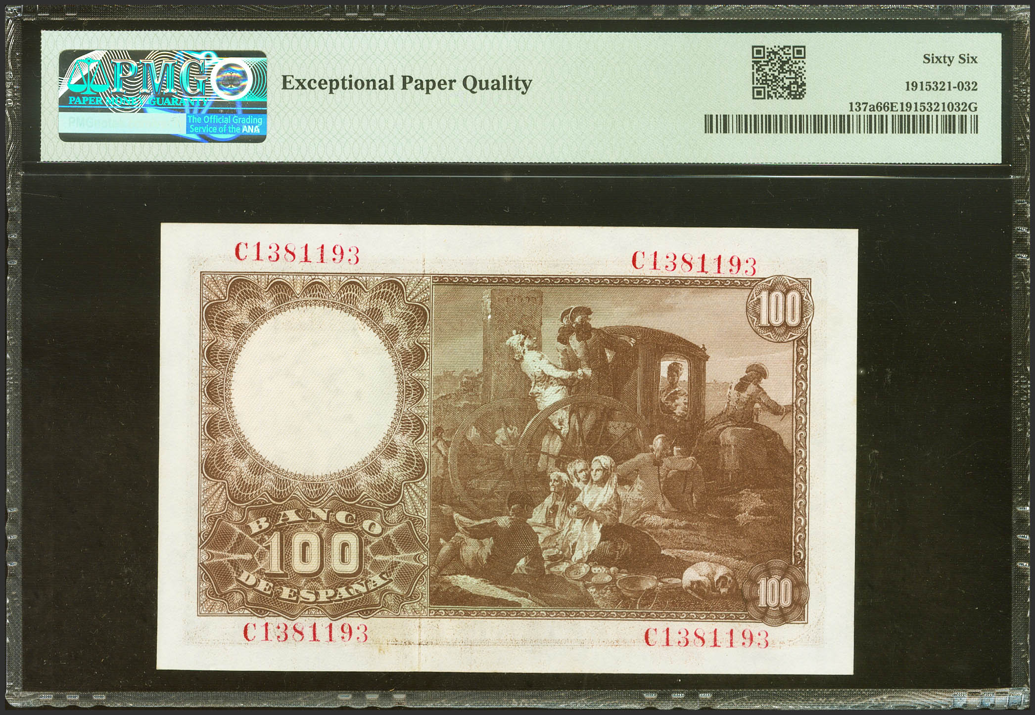 100 Pesetas. 2 de Mayo de 1948. Serie C. (Edifil 2023: 456a, Pick: 137a). Inusual en esta excepcional calidad, apresto original. SC. Encapsulado PMG66EPQ.