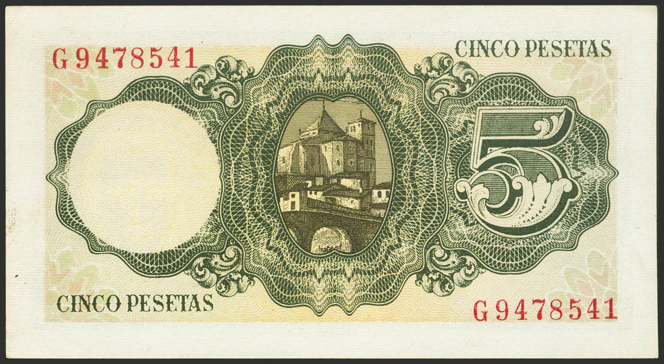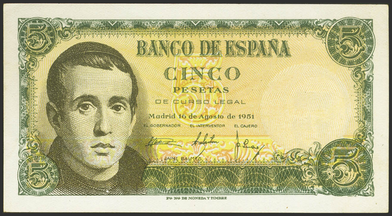 5 Pesetas. 16 de Agosto de 1951. Serie G. (Edifil 2021: 459a). Apresto original. SC-.