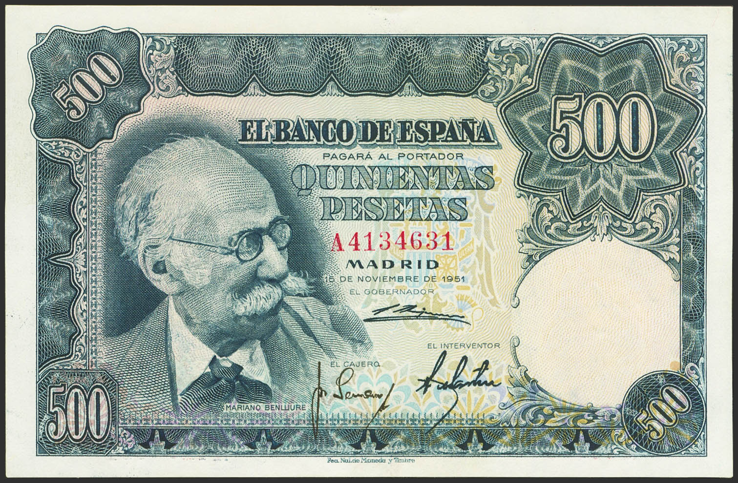 500 Pesetas. 15 de Noviembre de 1951. Serie A. (Edifil 2023: 460a). EBC-.