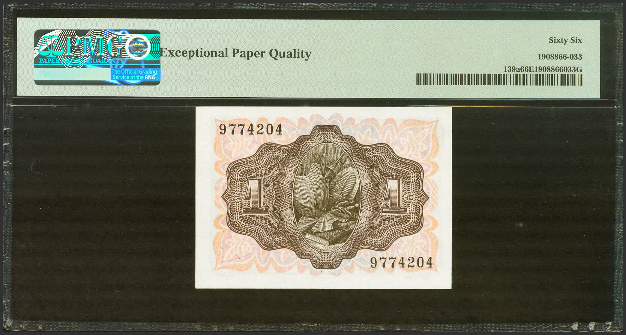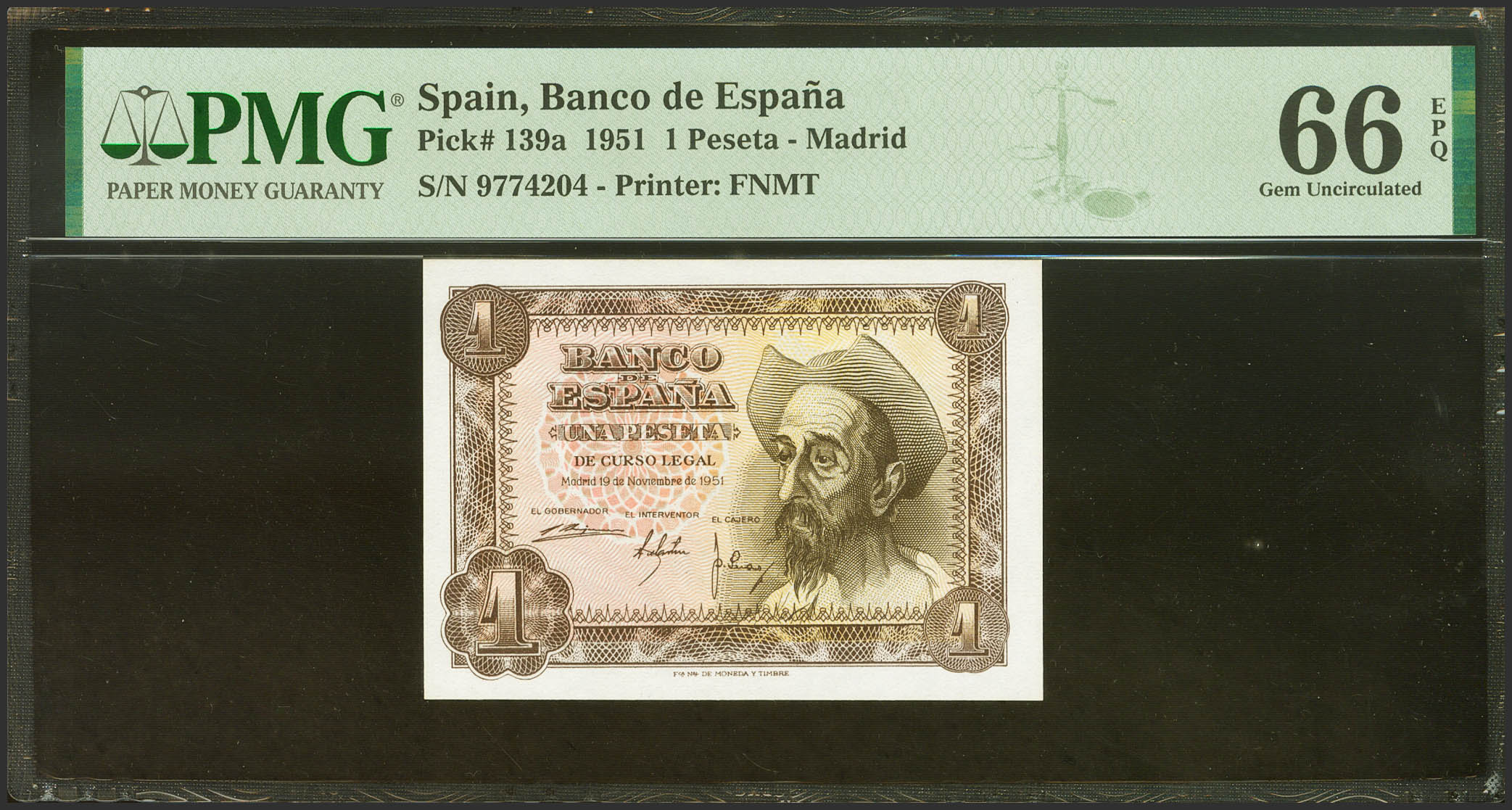 1 Peseta. 19 de Noviembre de 1951. Sin serie. (Edifil 2021: 461, Pick: 139a). Raro en esta excepcional calidad, apresto original. SC. Encapsulado PMG66EPQ.