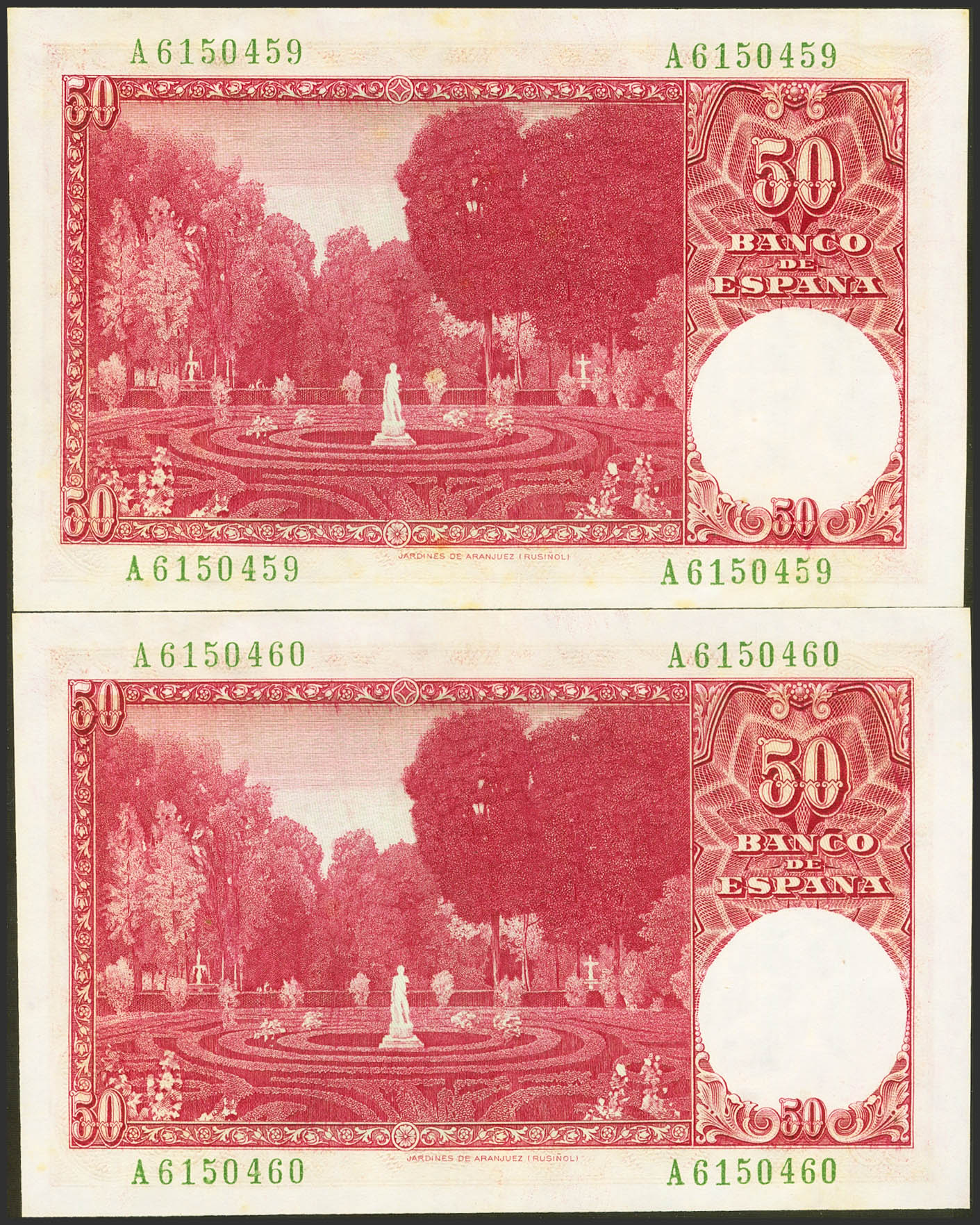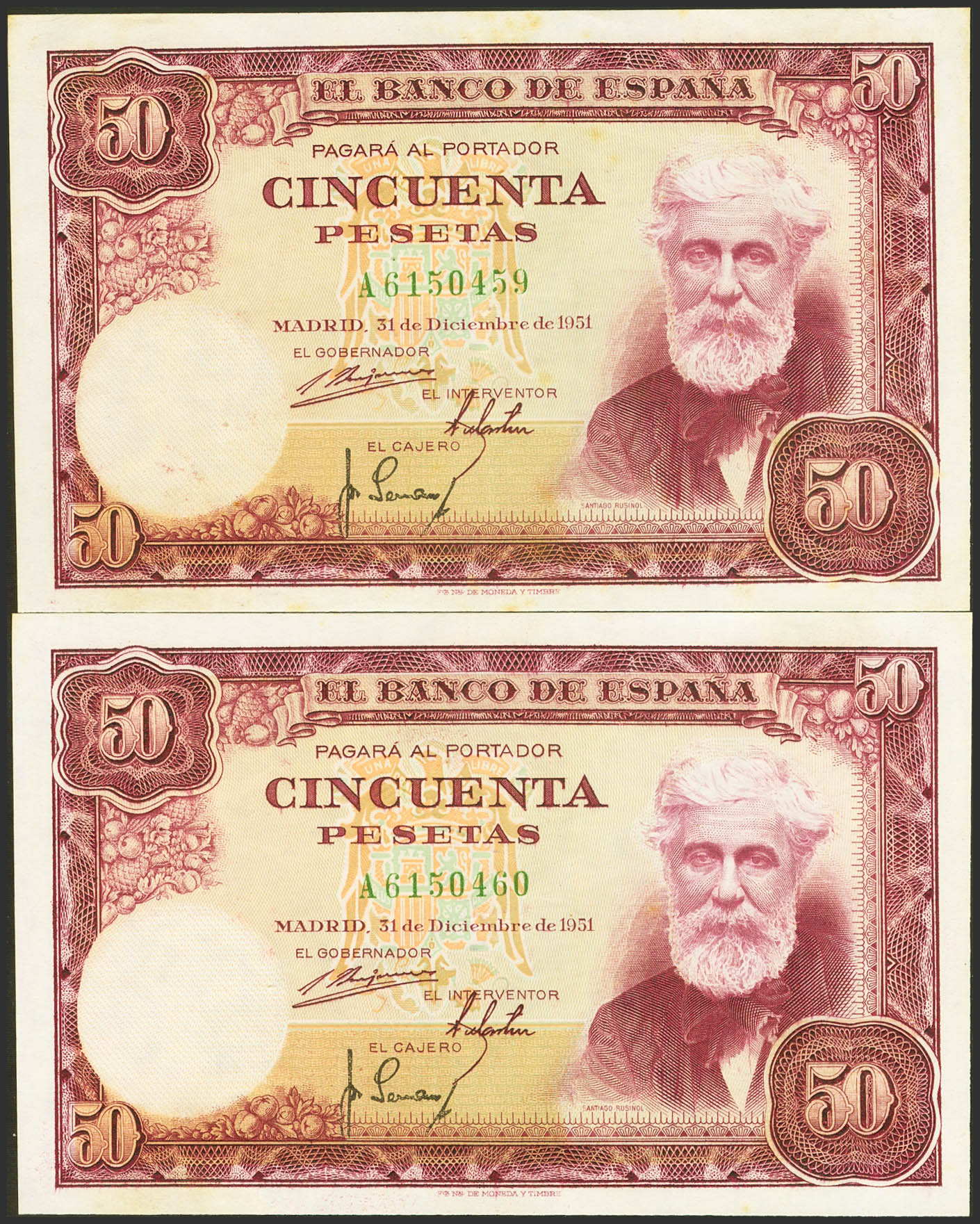 50 Pesetas. 31 de Diciembre de 1951. Pareja correlativa. Serie A. (Edifil 2021: 462a). Conserva gran parte del apresto original. EBC.