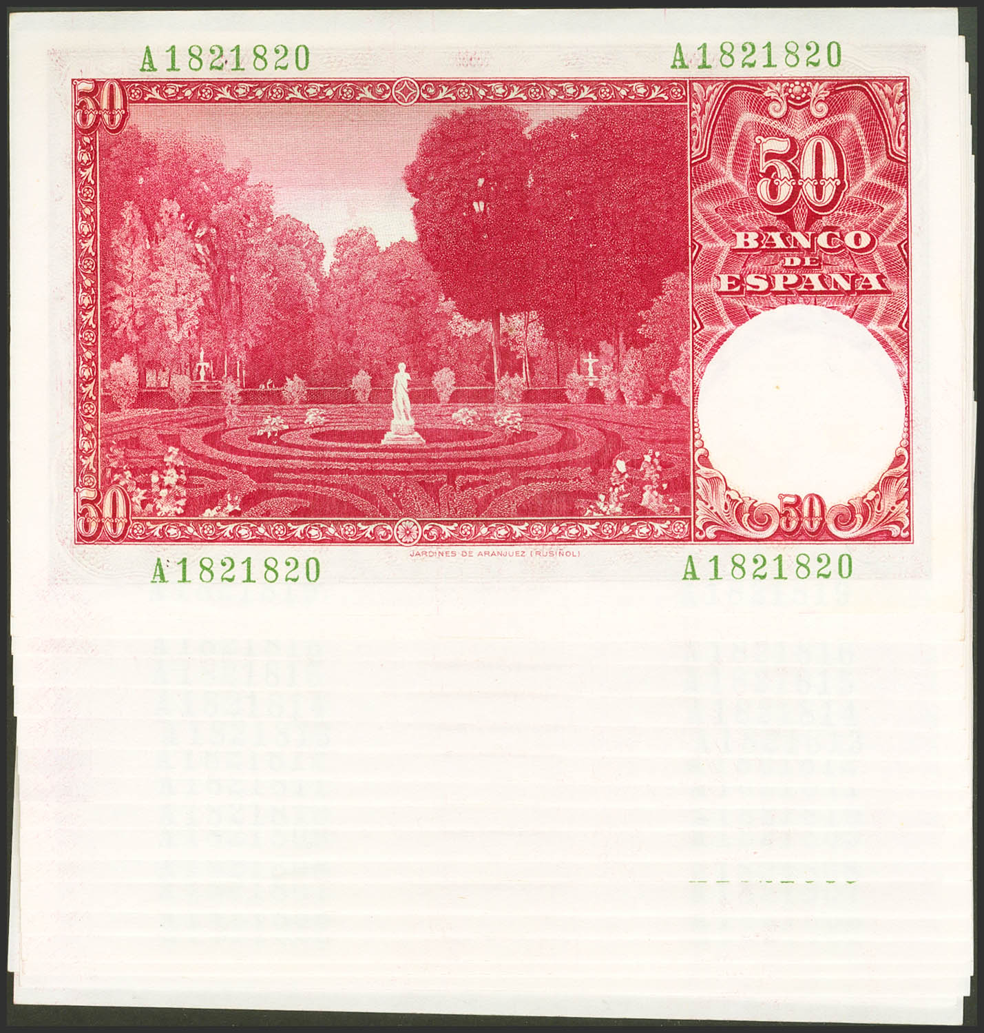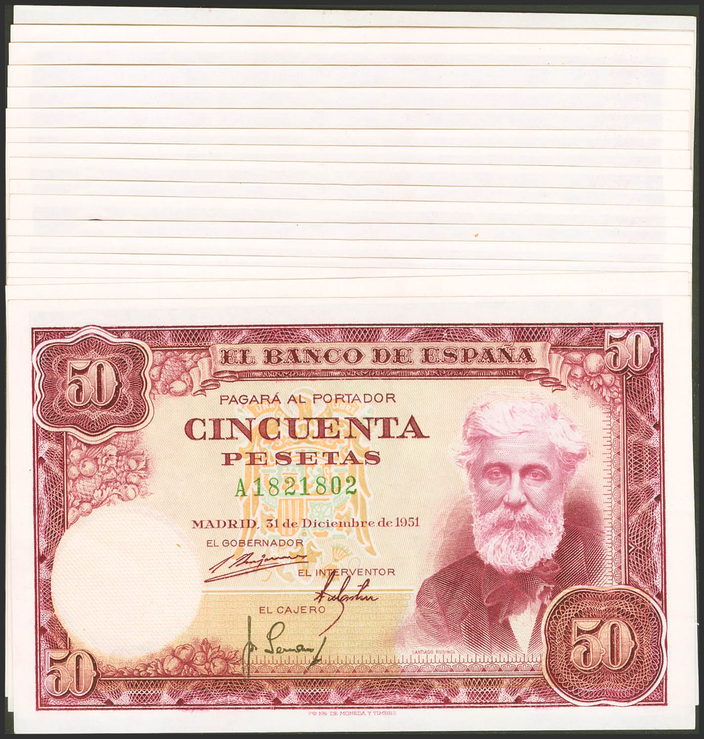 Interesantísimo y espectacular conjunto de 19 billetes correlativos de 50 Pesetas emitidos el 31 de Diciembre de 1951, todos ellos con la Serie A (Edifil 2021: 462a), conservando todo su espectacular apresto original. SC/SC-.