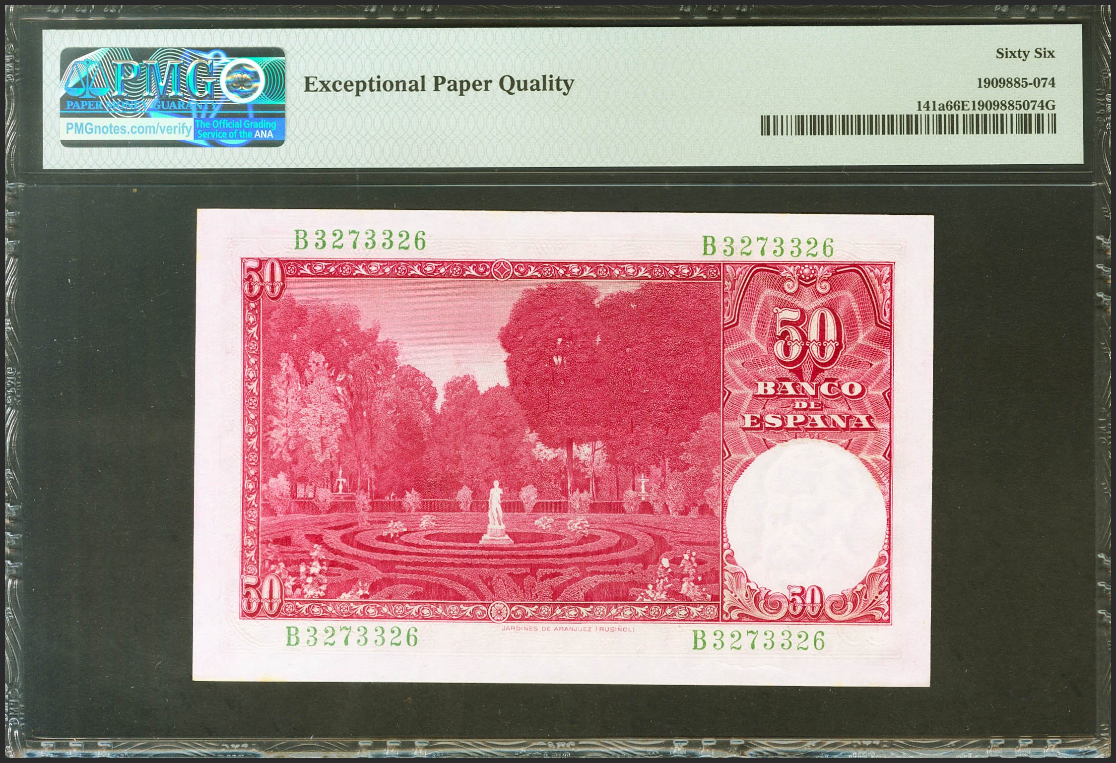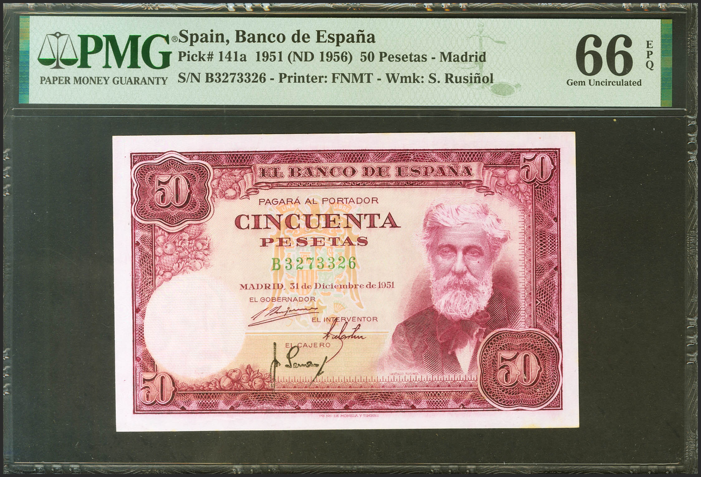 50 Pesetas. 31 de Diciembre de 1951. Serie B. (Edifil 2021: 462a, Pick: 141a). Raro en esta excepcional calidad, apresto original. SC. Encapsulado PMG66EPQ.