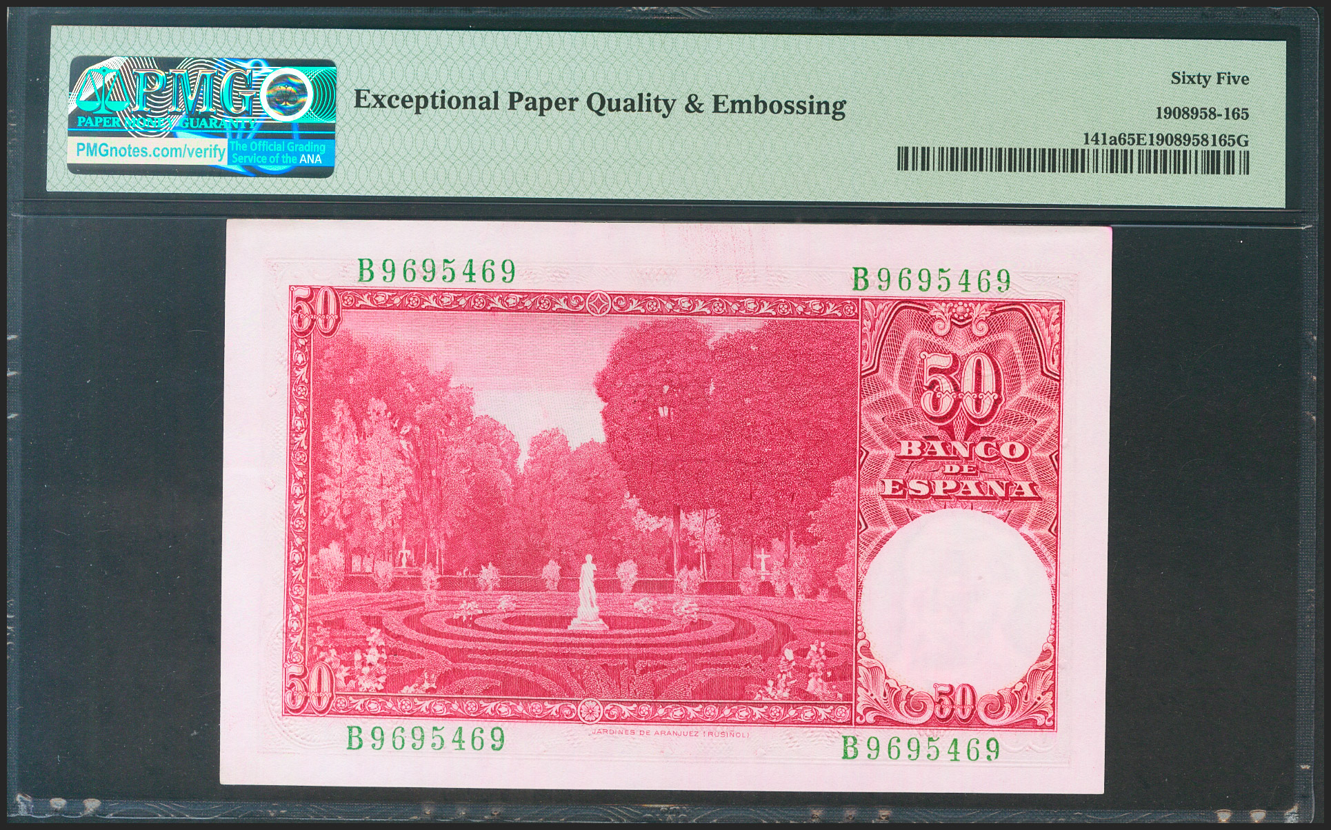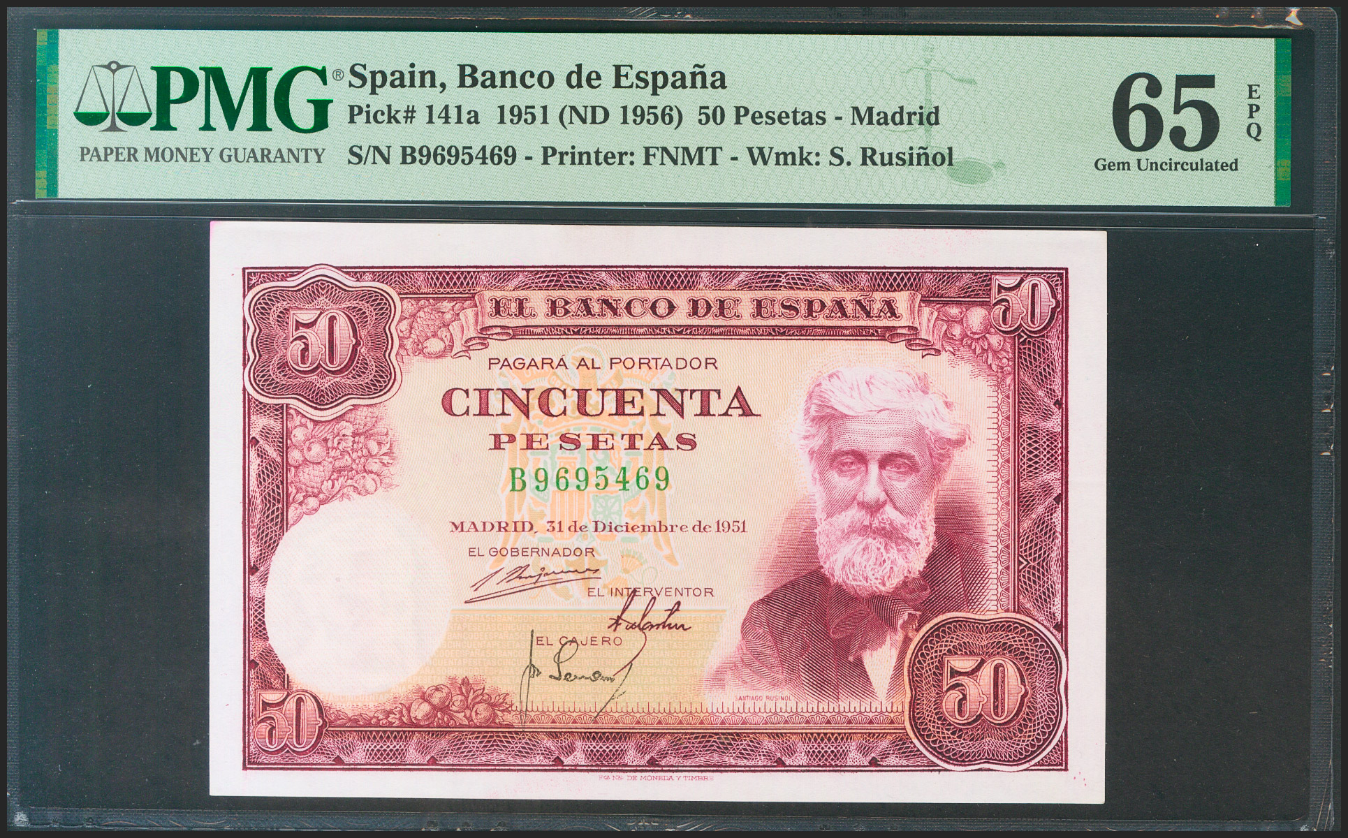 50 Pesetas. 31 de Diciembre de 1951. Serie B. (Edifil 2021: 462a, Pick: 141a). Raro en esta calidad, apresto original. SC. Encapsulado PMG65EPQ.