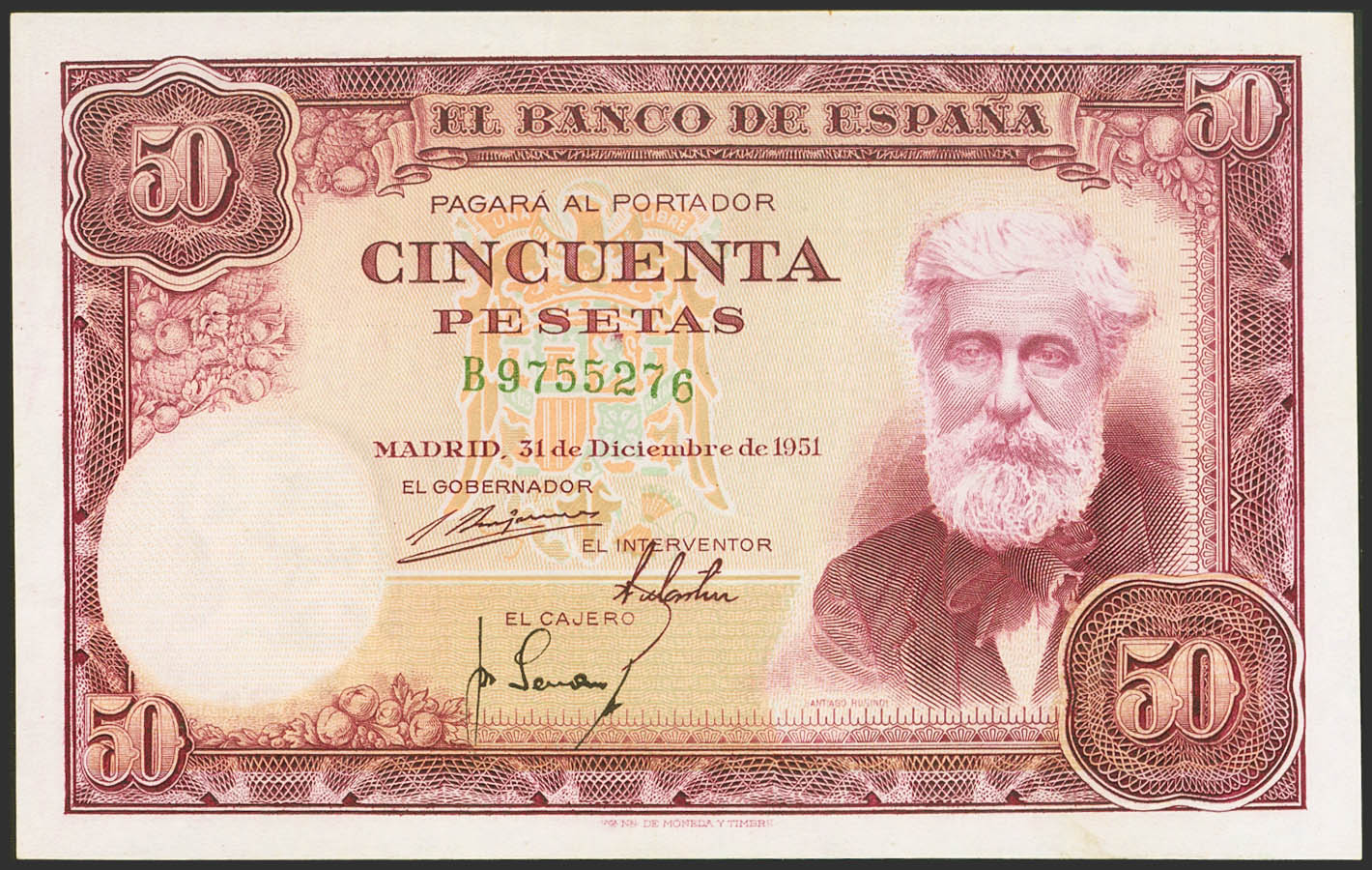 50 Pesetas. 31 de Diciembre de 1951. Serie B. (Edifil 2023: 462a). Conserva gran parte de su apresto original. EBC+.