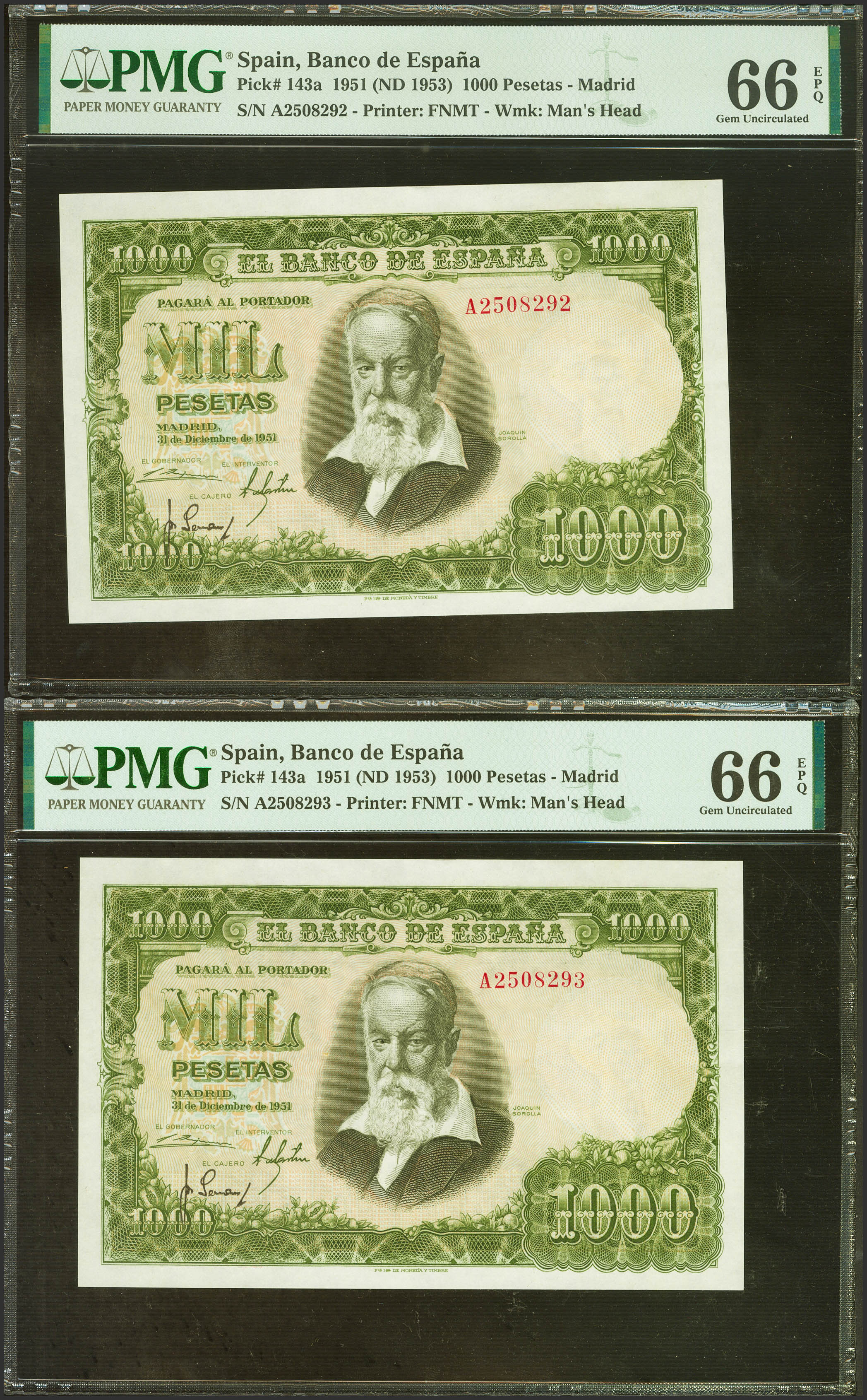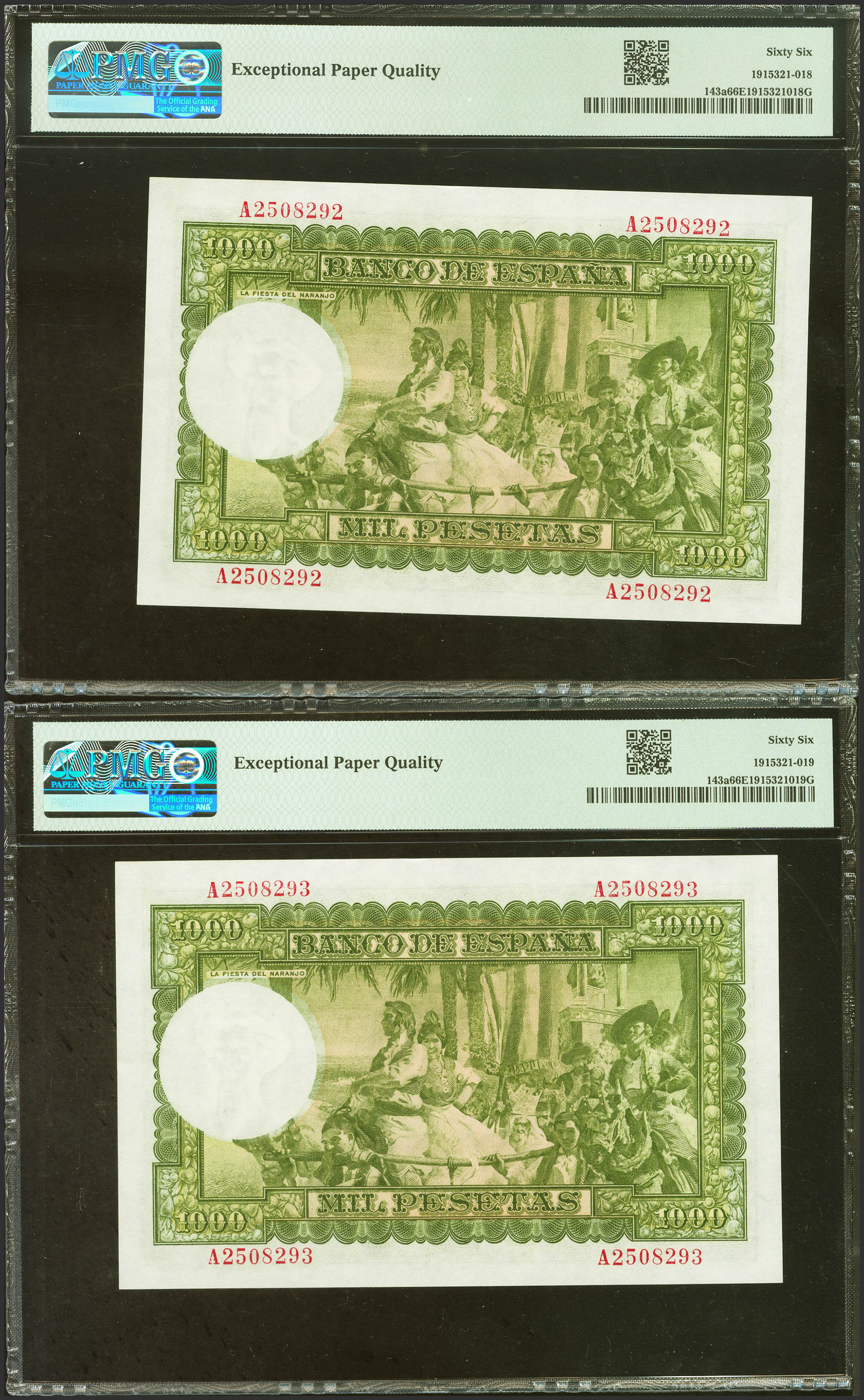 1000 Pesetas. 31 de Diciembre de 1951. Pareja correlativa. Serie A. (Edifil 2023: 463a, Pick: 143a). Muy rara en esta excepcional calidad, apresto original. SC. Encapsulados PMG66EPQ, ambos.