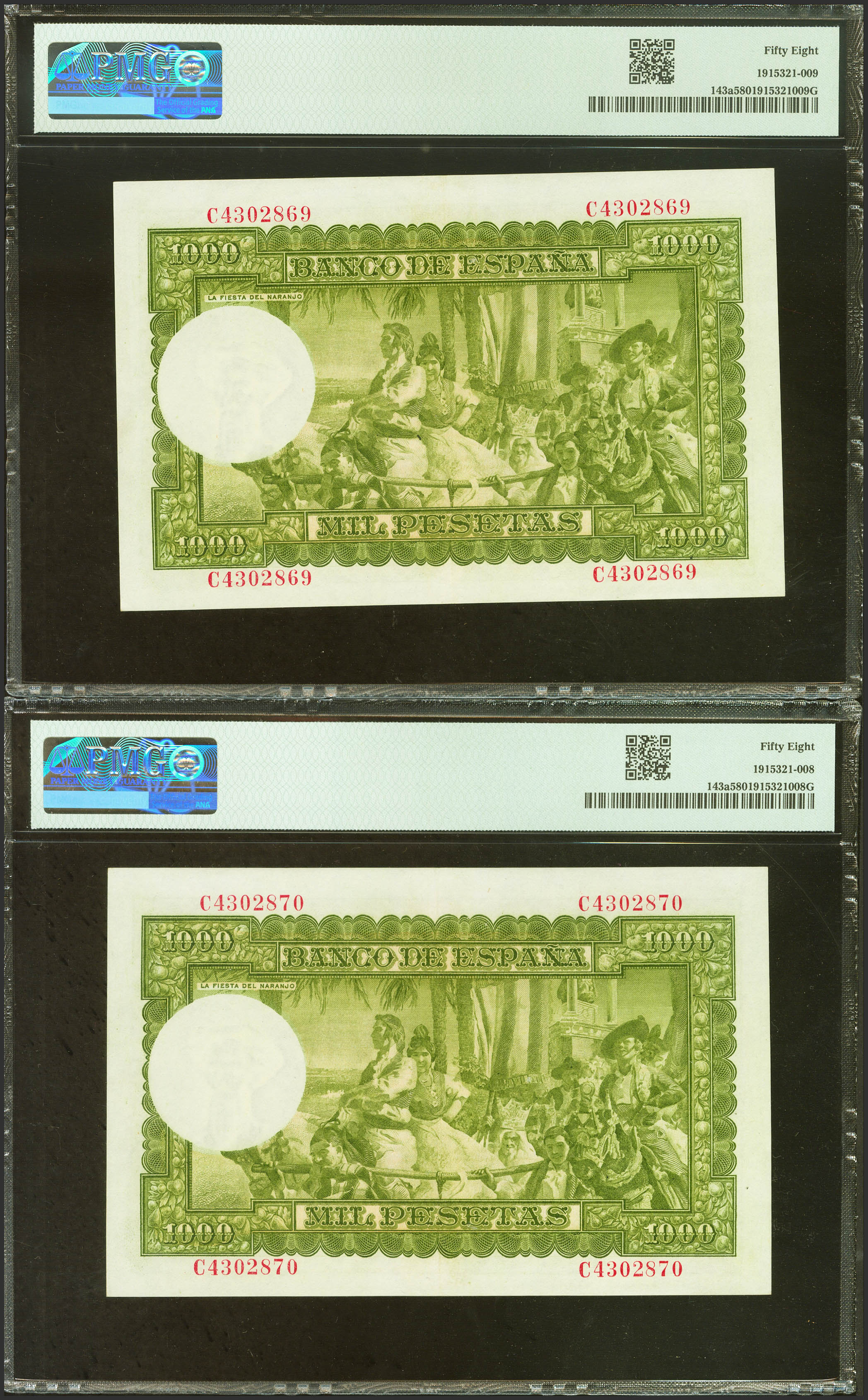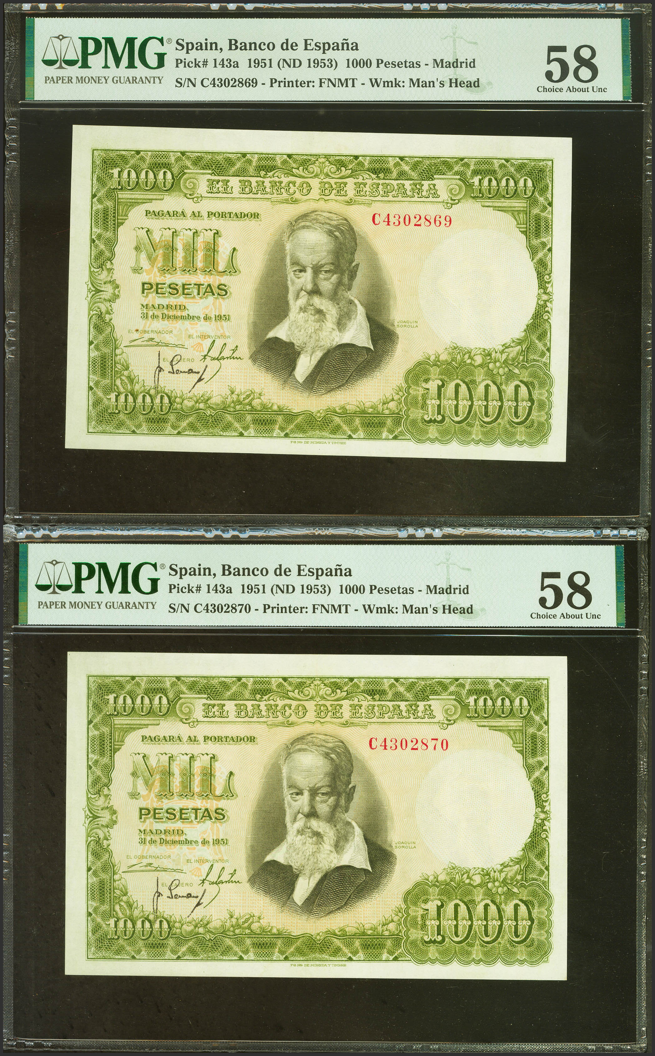 1000 Pesetas. 31 de Diciembre de 1951. Pareja correlativa. Serie C, última serie emitida. (Edifil 2023: 463b, Pick: 143a). EBC++. Encapsulados PMG58, ambos.