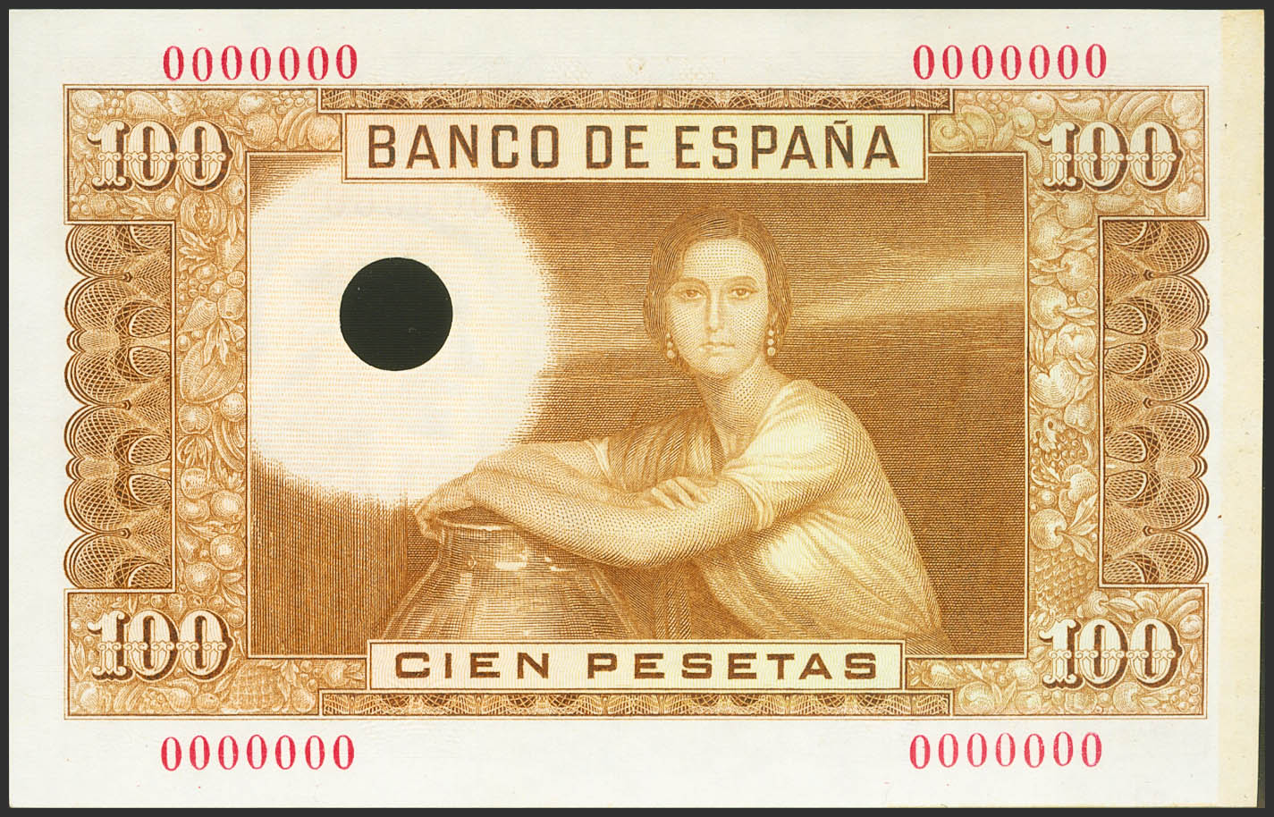 100 Pesetas. 7 de Abril de 1953. MUESTRA y numeración 0000000. (Edifil 2023: 464Ma). Apresto original, previamente montado. SC-.