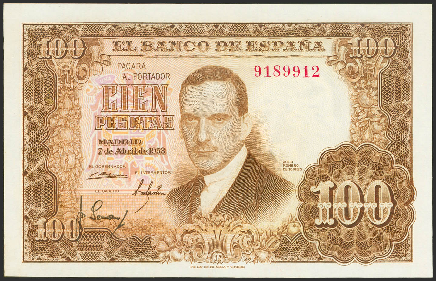 100 Pesetas. 7 de Abril de 1953. Sin serie. (Edifil 2021: 464). Inusual en esta excepcional calidad, conserva todo su apresto original. SC.