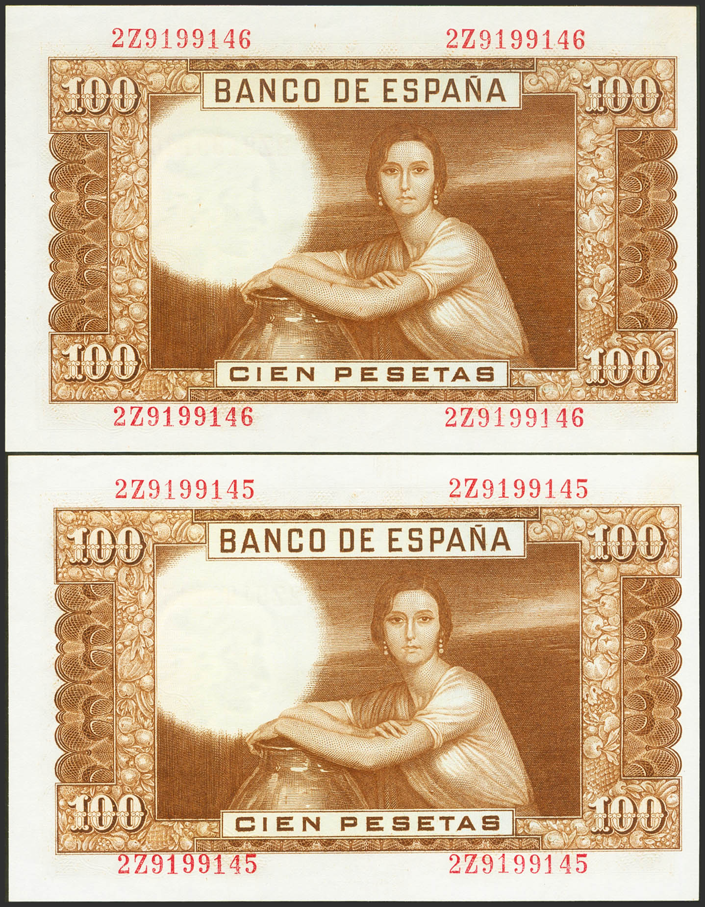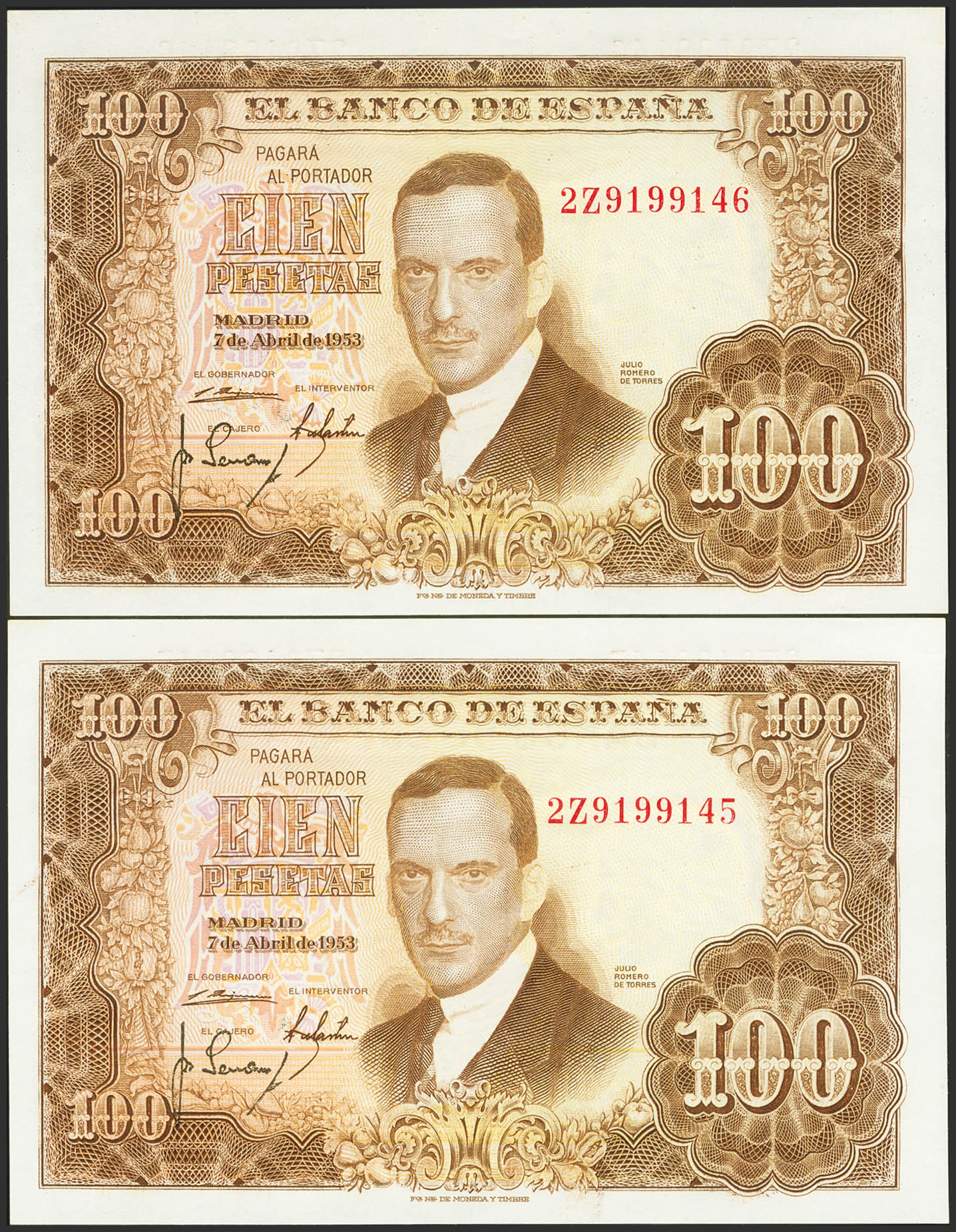 100 Pesetas. 7 de Abril de 1953. Pareja correlativa. Serie 2Z. (Edifil 2021: 464c). Apresto original. SC.