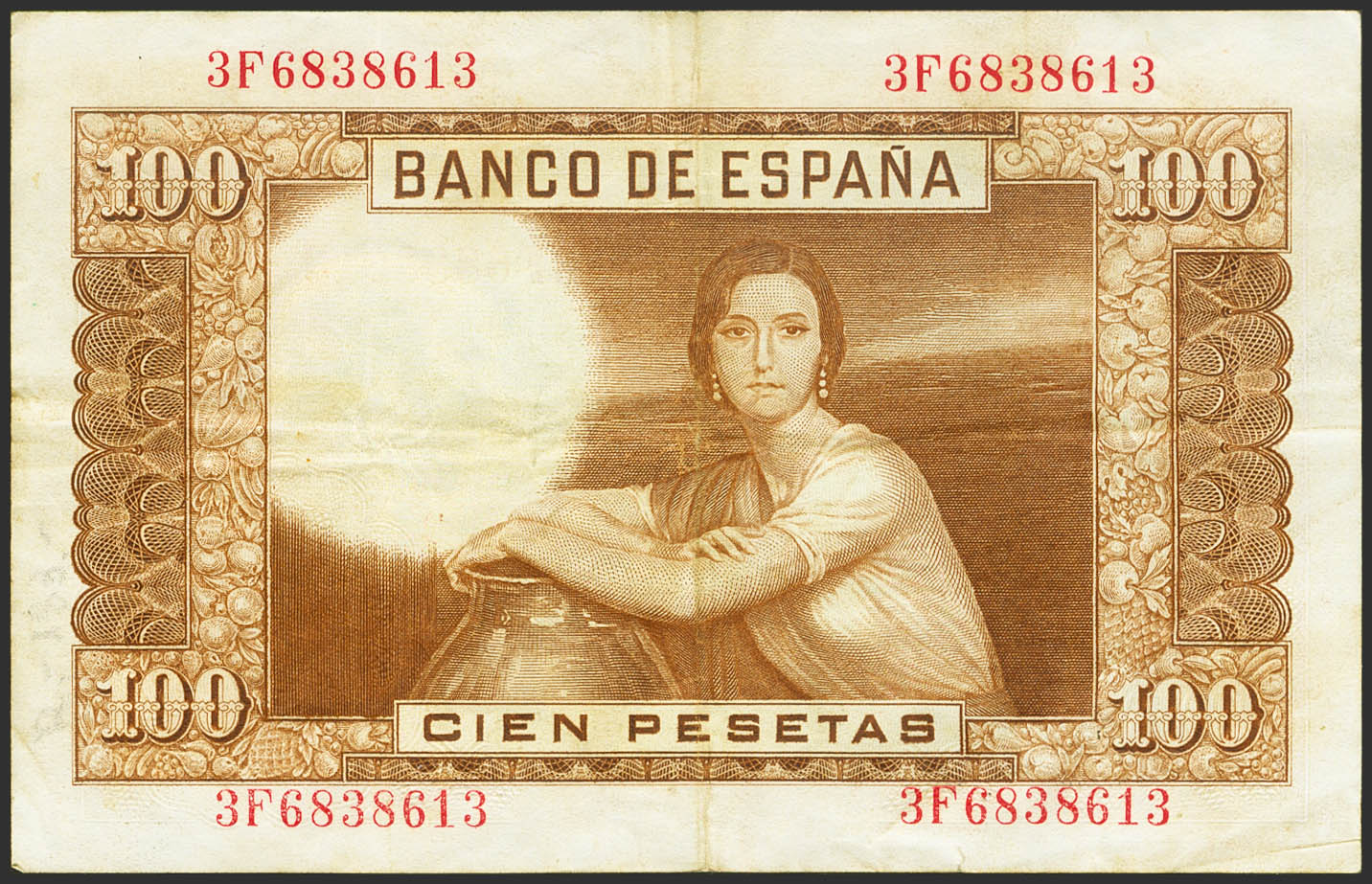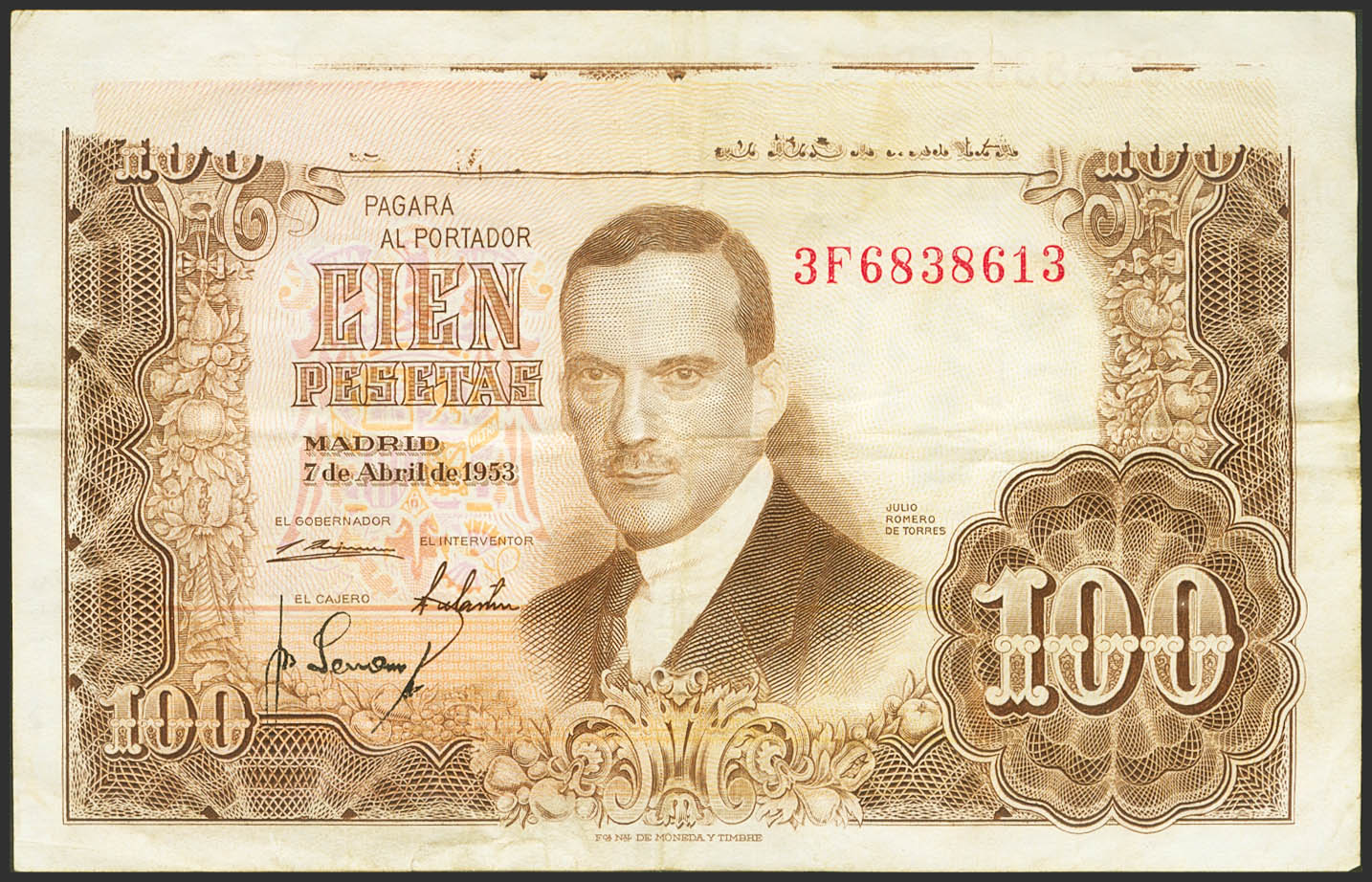 100 Pesetas. 7 de Abril de 1953. Error de impresión en la parte superior. Serie 3F. (Edifil 2023: 464c). Raro, pieza de enorme espectacularidad. MBC+.