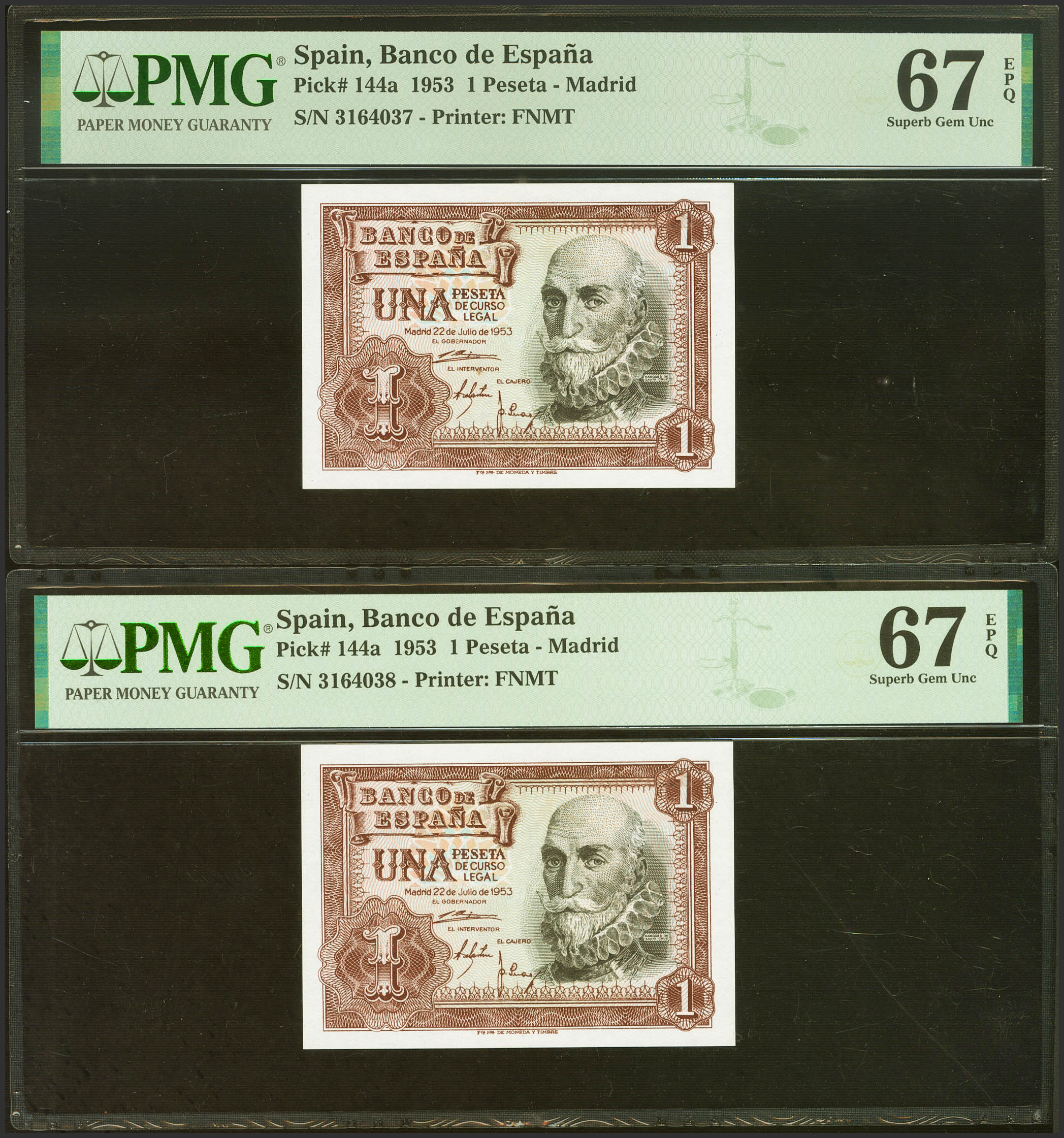 1 Peseta. 22 de Julio de 1953. Pareja correlativa. Sin serie. (Edifil 2021: 465, Pick: 144a). Inusual en esta calidad, apresto original. SC. Encapsulado PMG67EPQ, ambos.