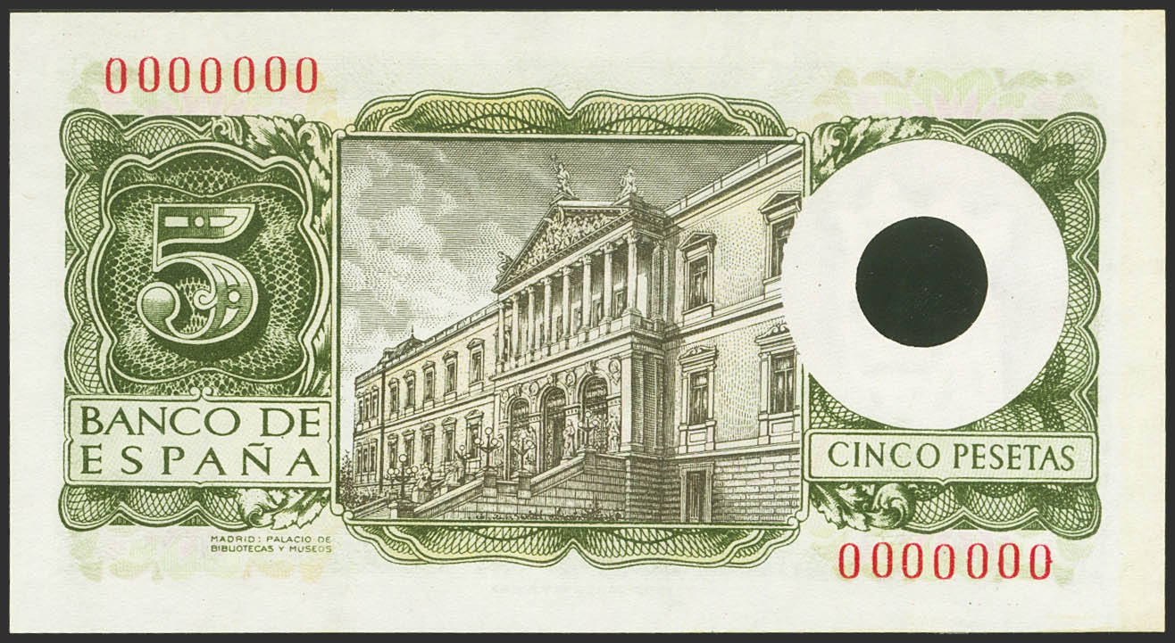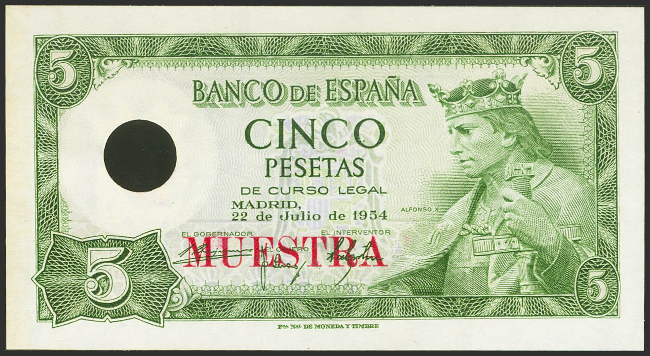 5 Pesetas. 22 de Julio de 1954. MUESTRA y numeración 0000000. (Edifil 2023: 466Ma). Apresto original, previamente montado. SC-.
