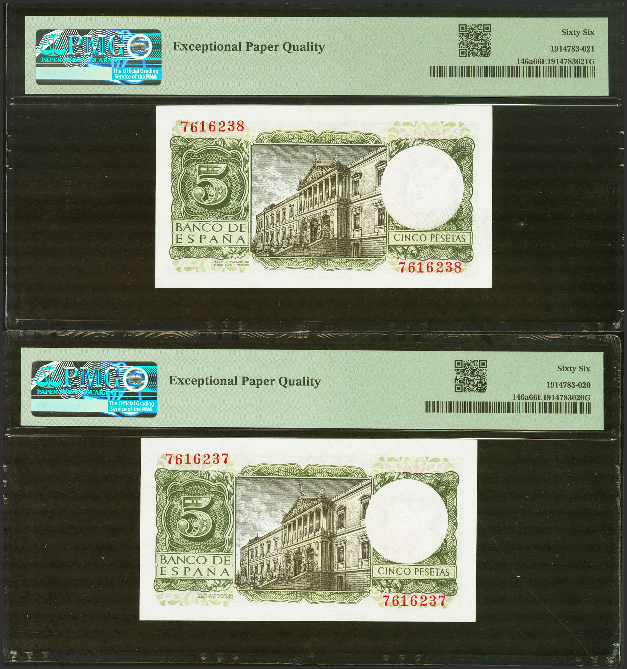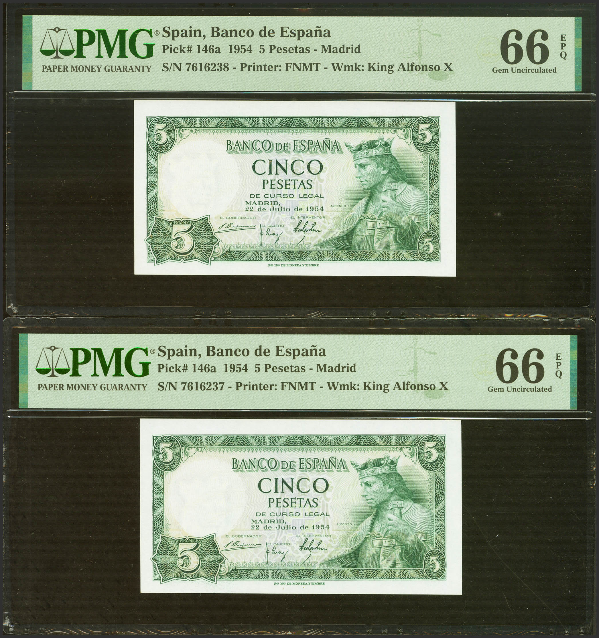 5 Pesetas. 22 de Julio de 1954. Pareja correlativa. Sin serie. (Edifil 2021: 466, Pick: 146a). Inusual en esta calidad, apresto original. SC. Encapsulado PMG66EPQ, ambos.