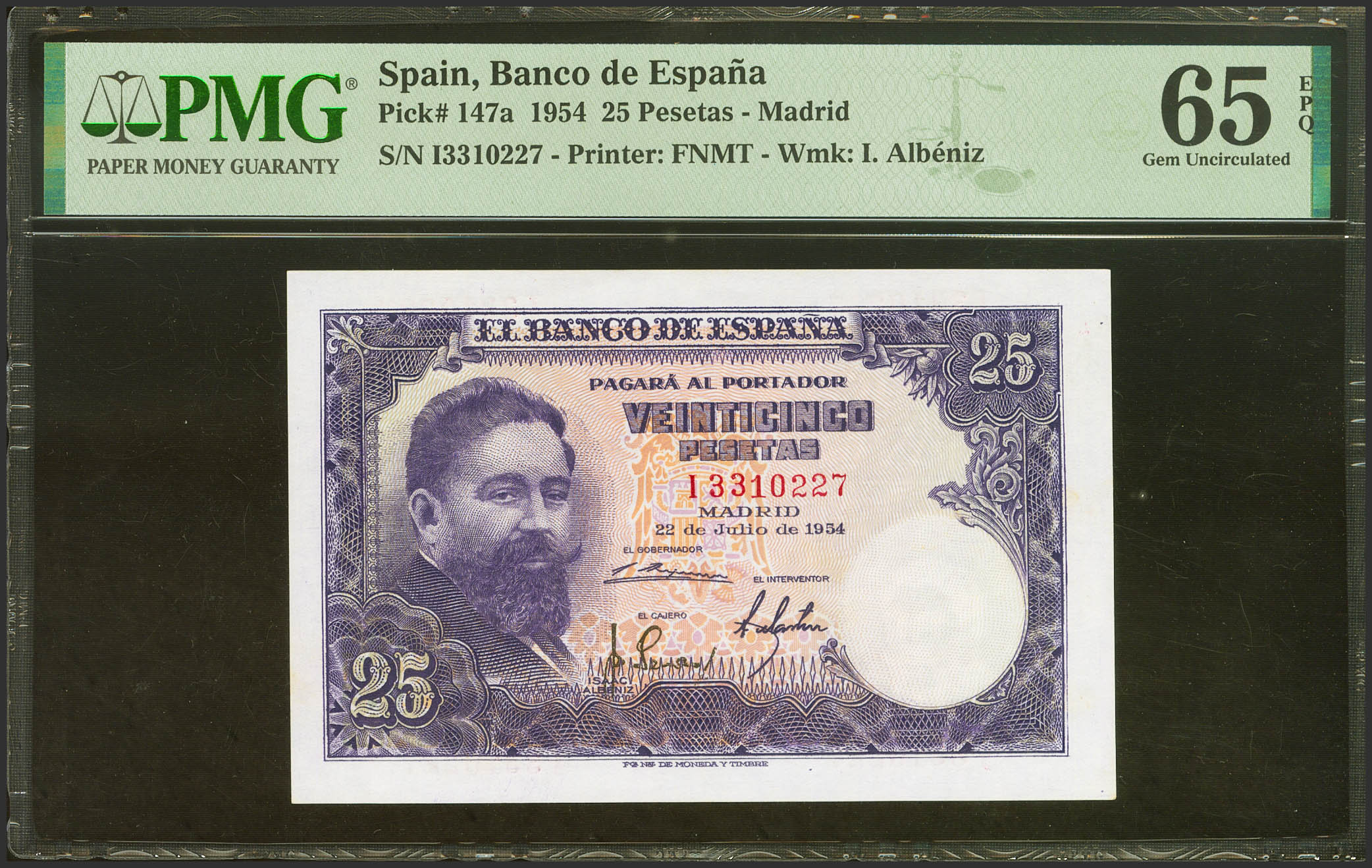 25 Pesetas. 22 de Julio de 1954. Serie I. (Edifil 2023: 467a, Pick: 147a). Inusual en esta calidad, apresto original. SC. Encapsulado PMG65EPQ.