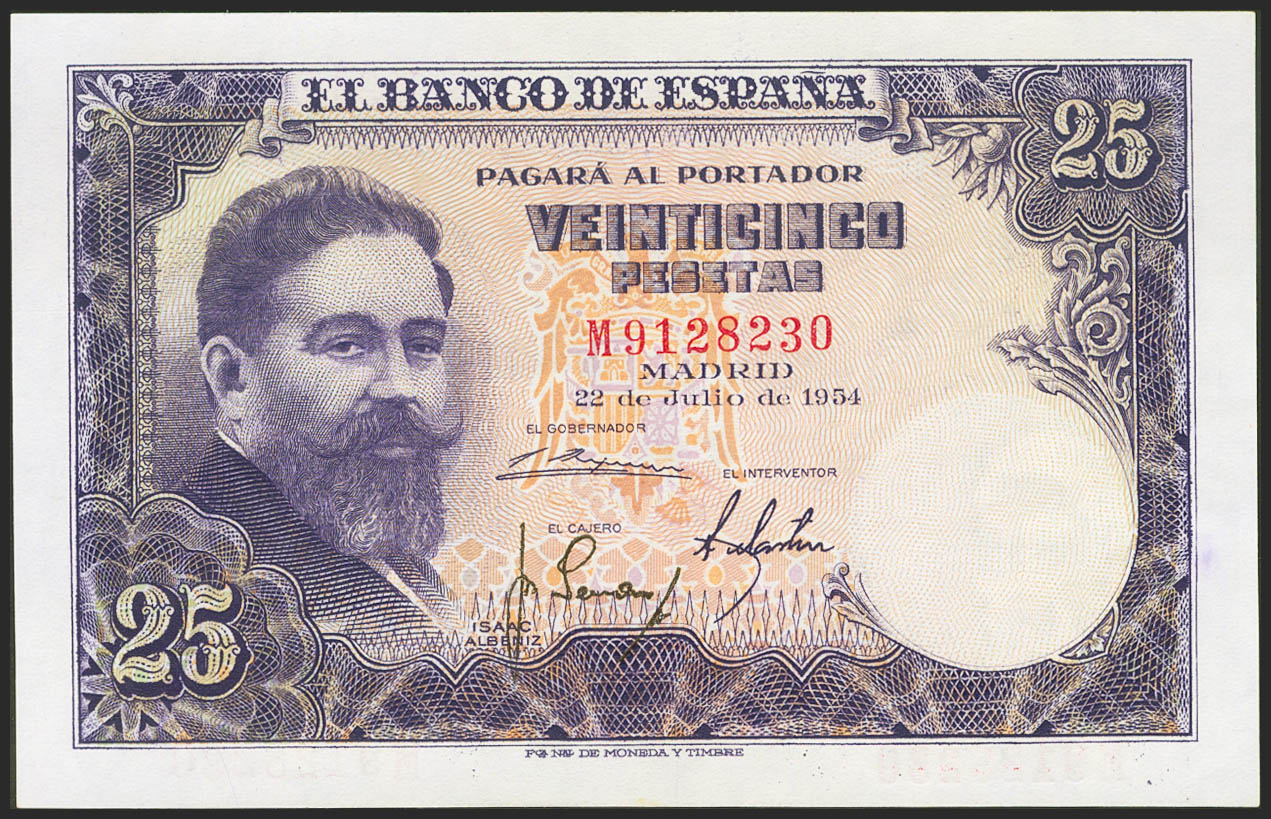 25 Pesetas. 22 de Julio de 1954. Serie M. (Edifil 2021: 467a). Conserva todo su apresto original. SC.