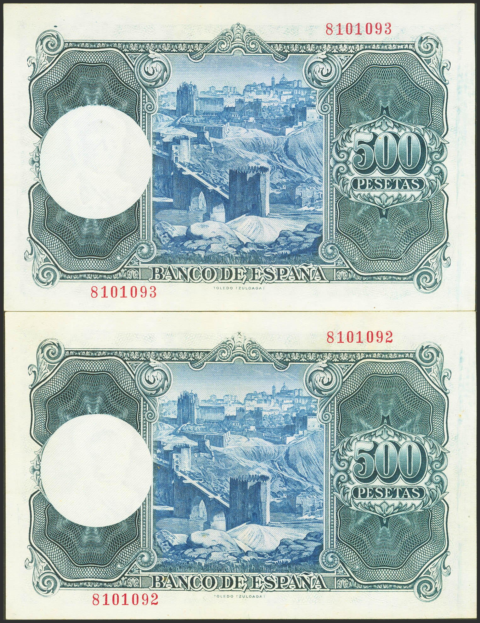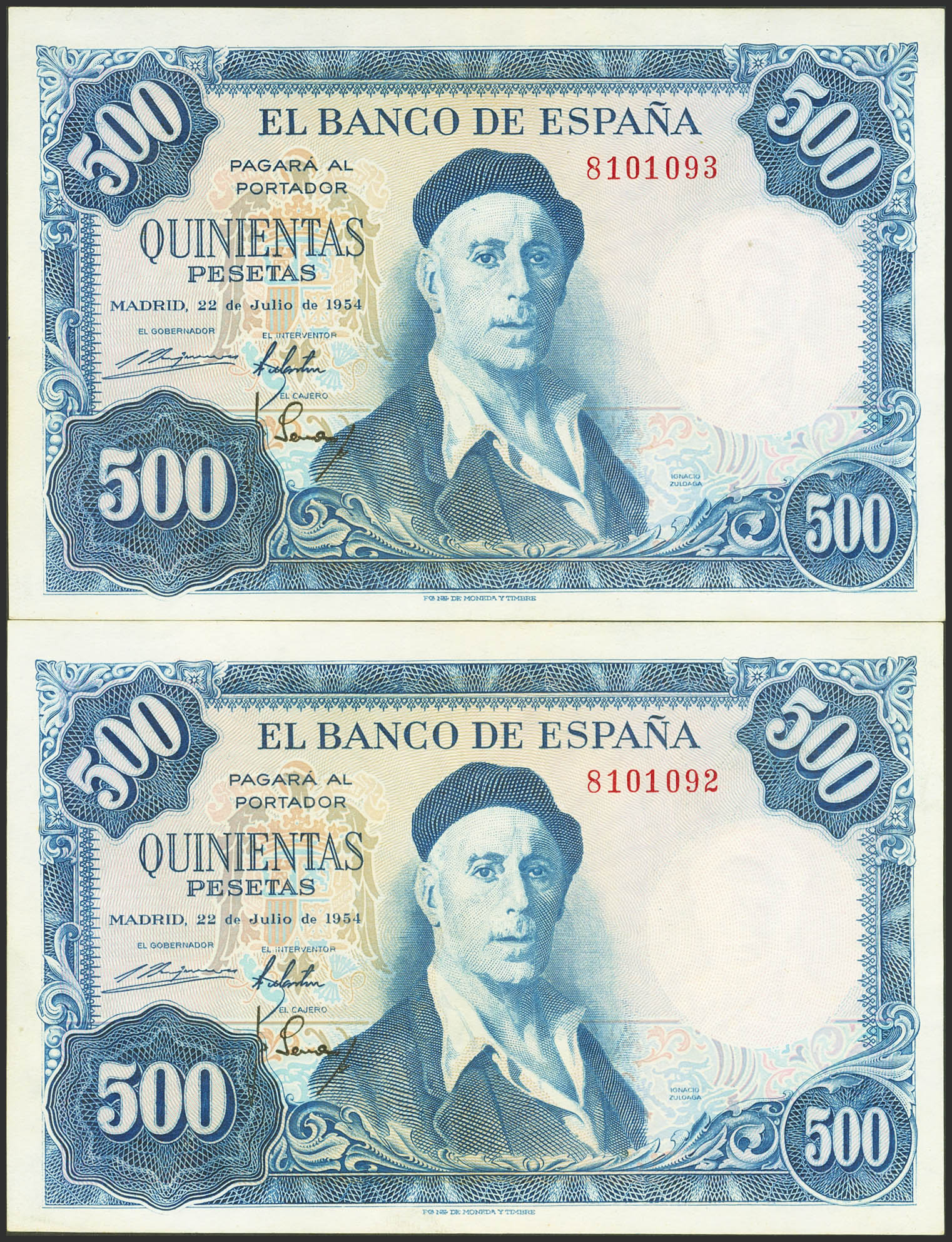 500 Pesetas. 22 de Julio de 1954. Pareja correlativa. Sin serie. (Edifil 2023: 468). Inusual, conserva parte de su apresto original. EBC+.